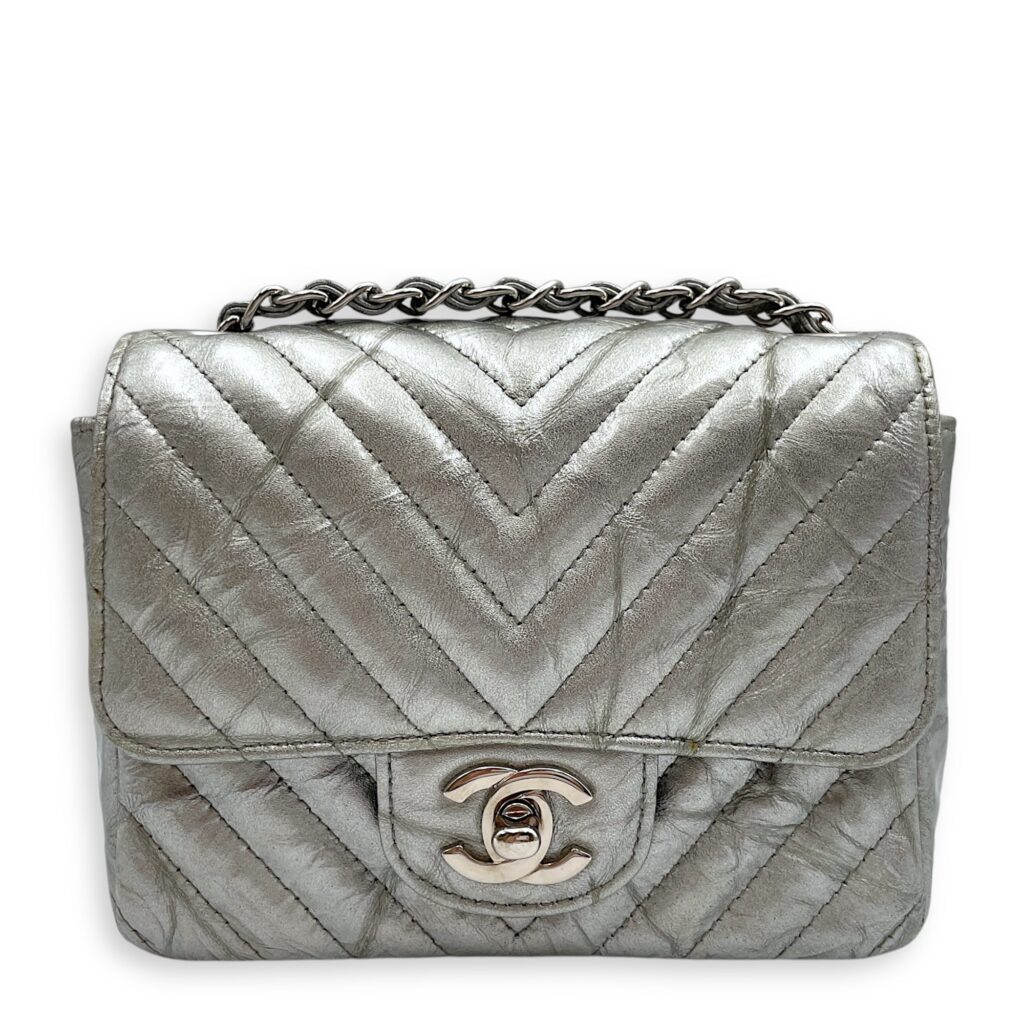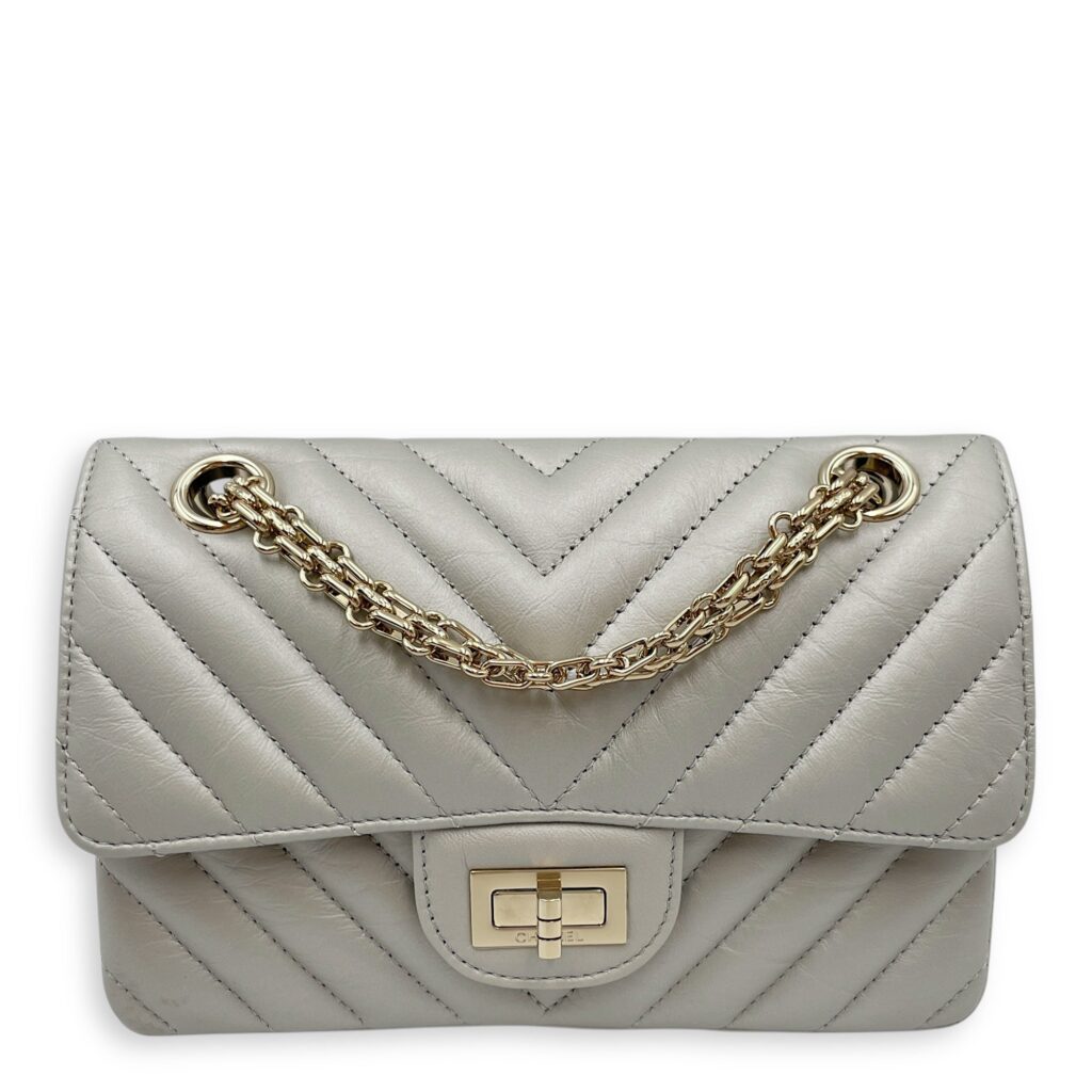 Chevron 22.55 Reissue Mini Metallic Grey Crossbody Bag in Lambskin, Gold hardware