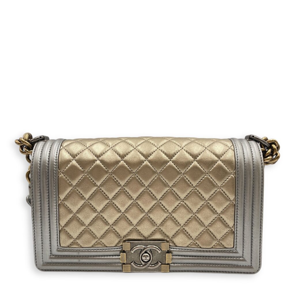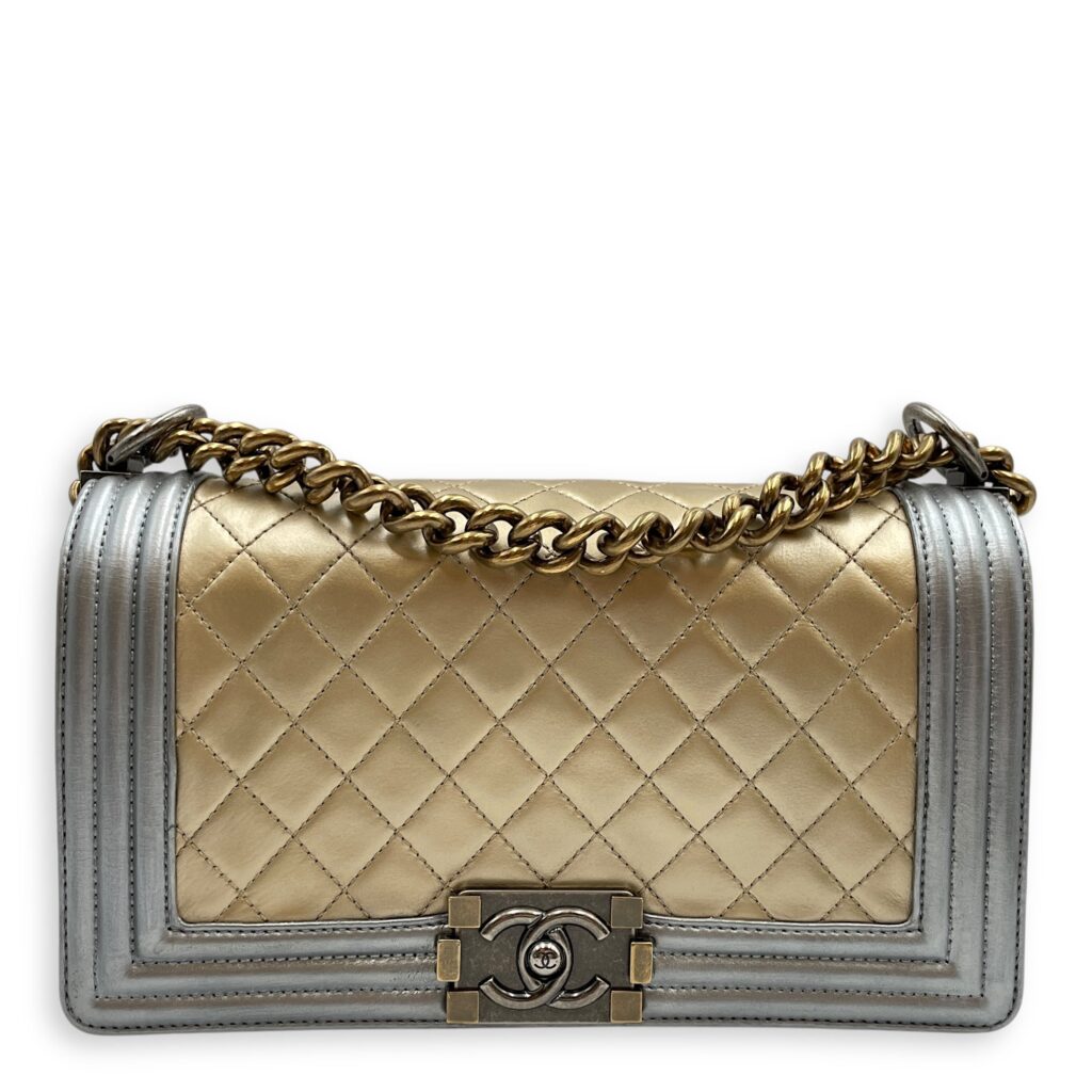 Quilted Bi-Colour Boy Medium Gold/Silver Shoulder Bag in Metallic, Brushed Gold hardware