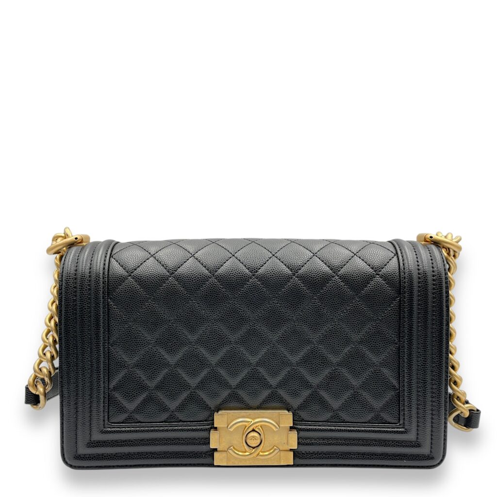 Quilted Boy (25cm) Medium Black Shoulder Bag in Caviar Leather, Guilloche hardware