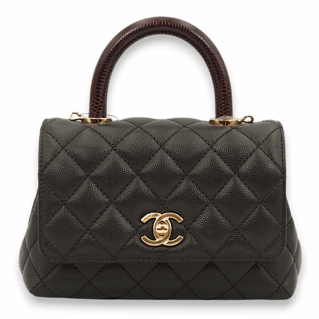 Quilted Coco Handle (19cm) Mini Black/Burgundy Handle Top Handle Bag in Caviar Leather, Gold hardware