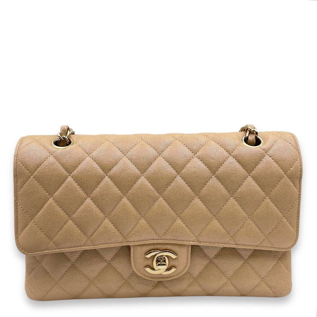 Quilted CC Classic Medium Pearly Beige Double Flap Bag in Caviar Leather, Gold hardware