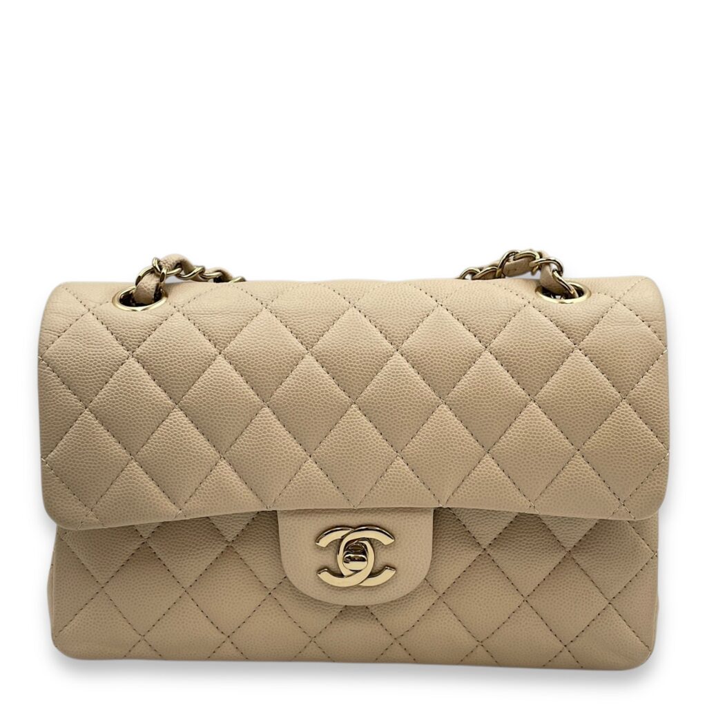Quilted CC Classic Small Beige Double Flap Bag in Caviar Leather, Gold hardware