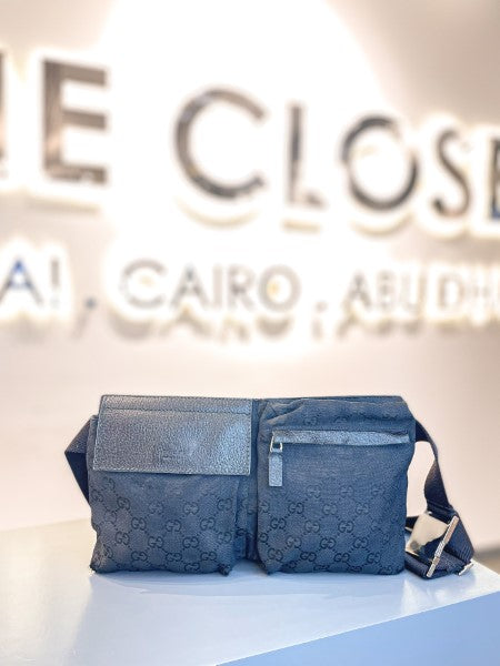 Gucci Black GG Monogram Web Double Pocket Waist Bag