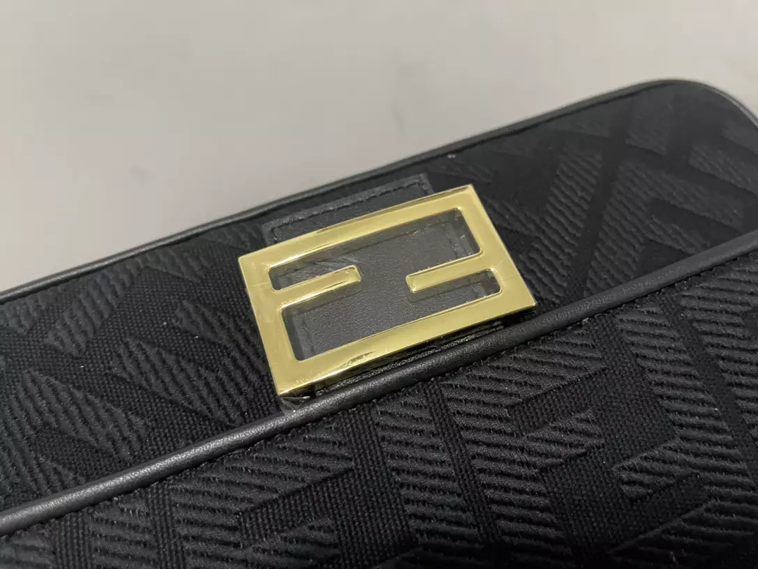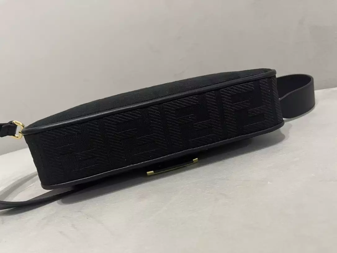 #Fendi #BaguetteBag #MediumSize #BlackCanvas #RaisedEmbroideredFFMotif #LeatherTrim #FFClasp #MagneticClasp #VintageGoldFinishHardware #FashionAccessory