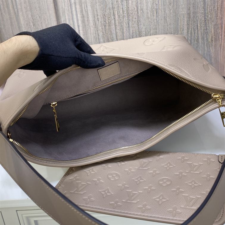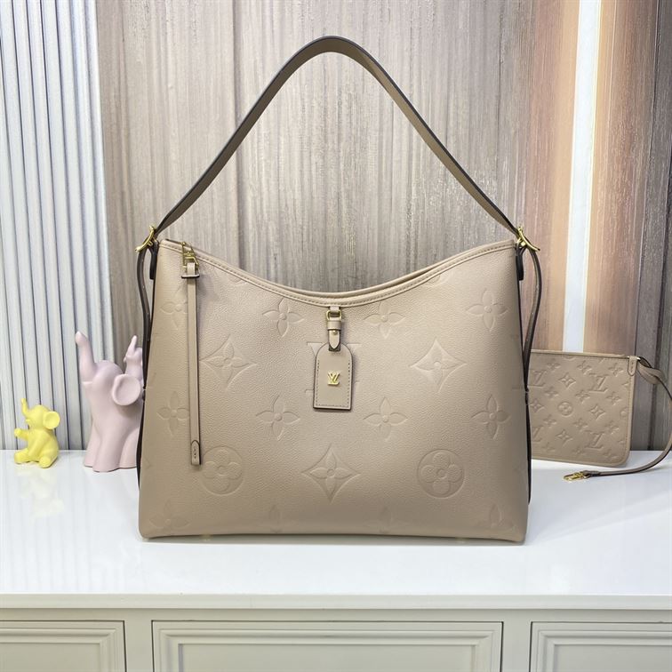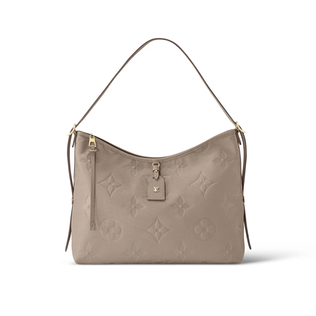 CarryAll MM Handbag Tourterelle Gray crafted from Monogram Empreinte. The strap adjusts for hand, shoulder or cross-body carry. Removable zipped pouch attached by a leather cord.