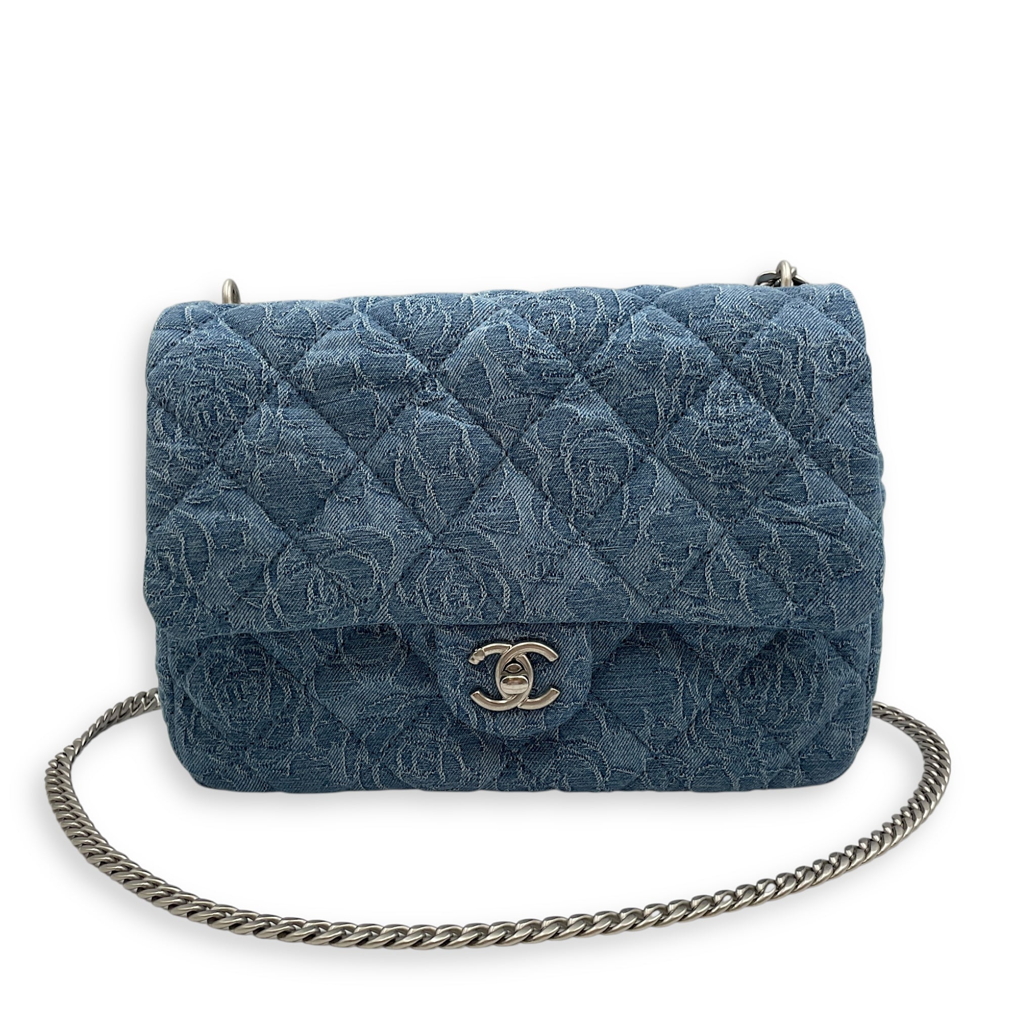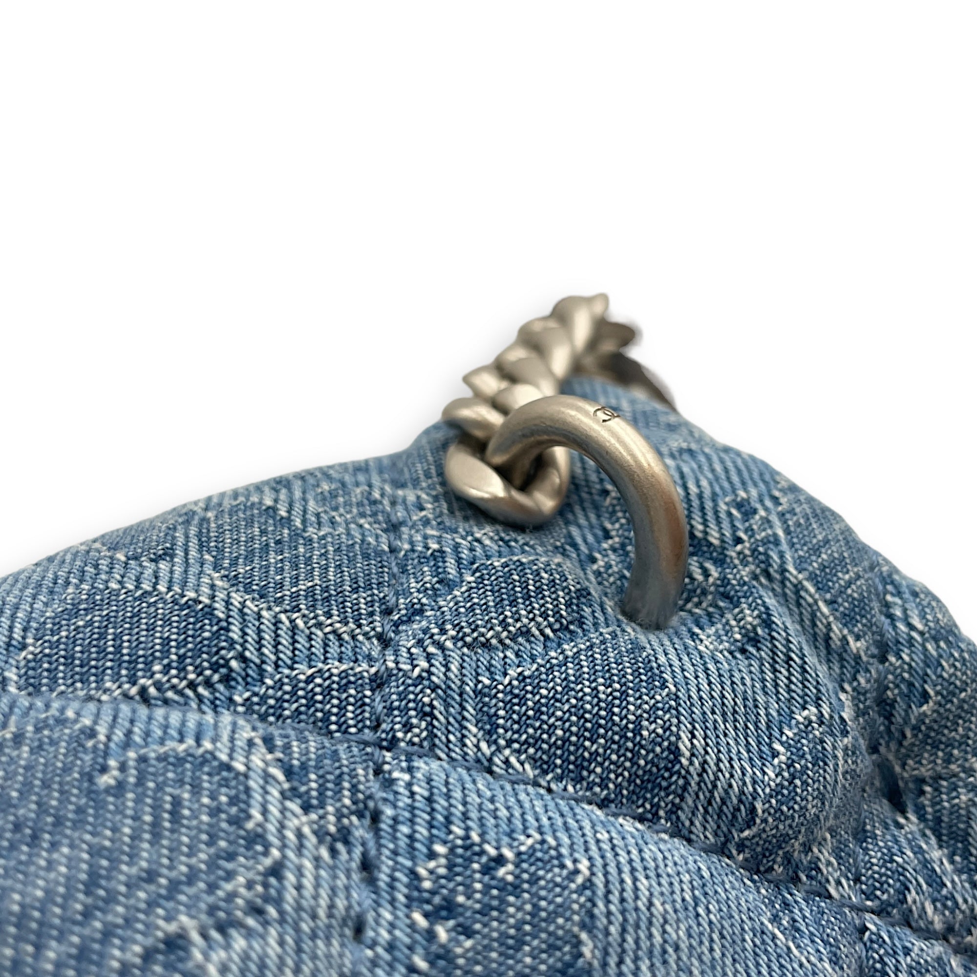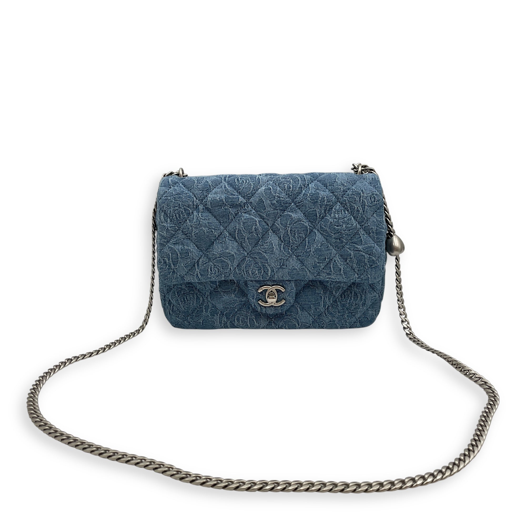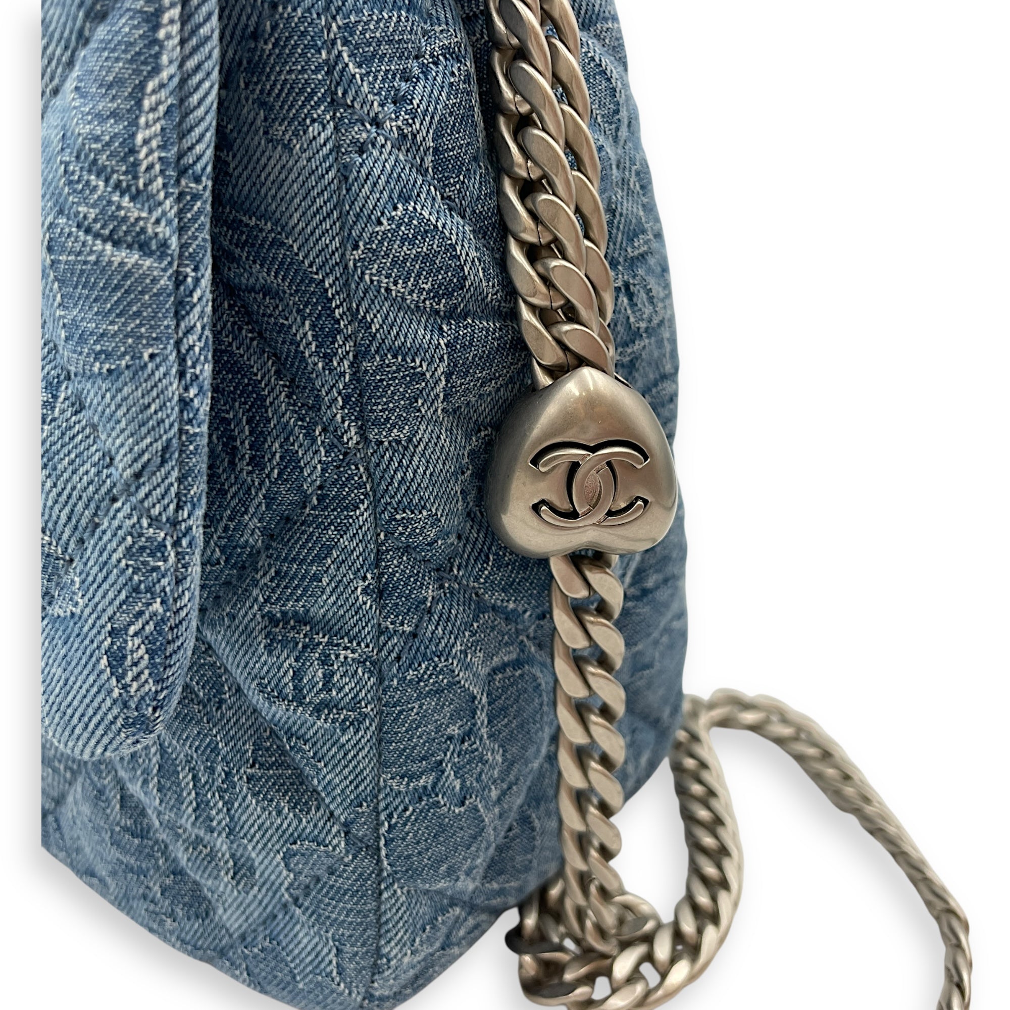 Be the first to review “CC Adjustable Heart Pearl Crush Chain Light Blue Flap Bag in Denim, Silver hardware”