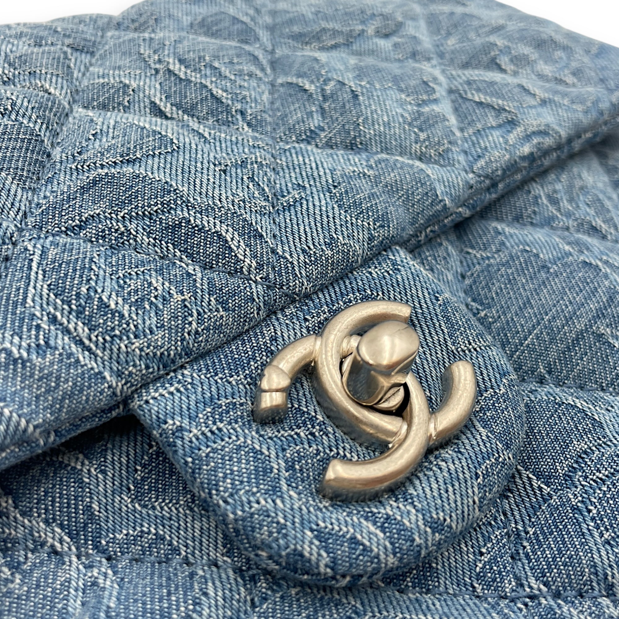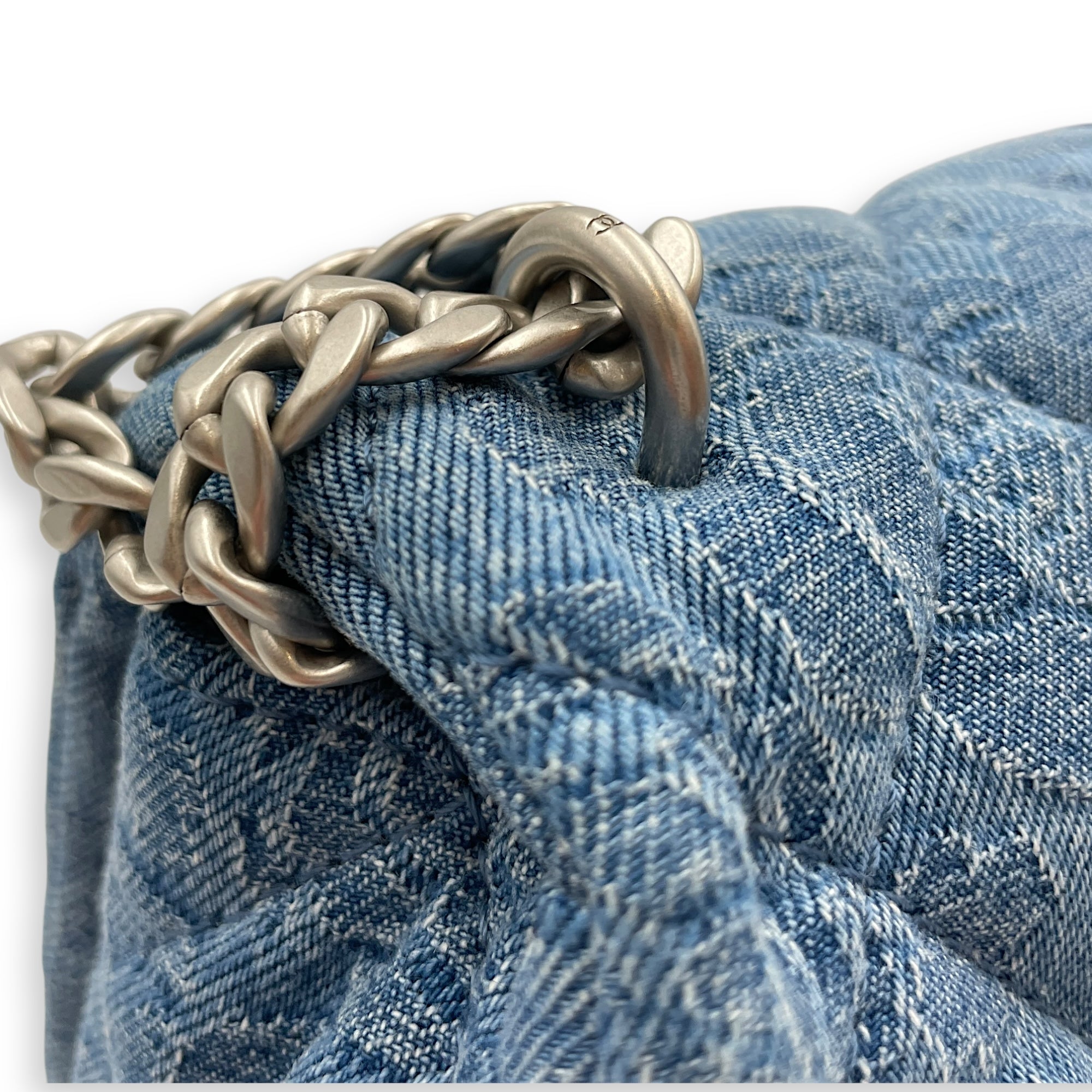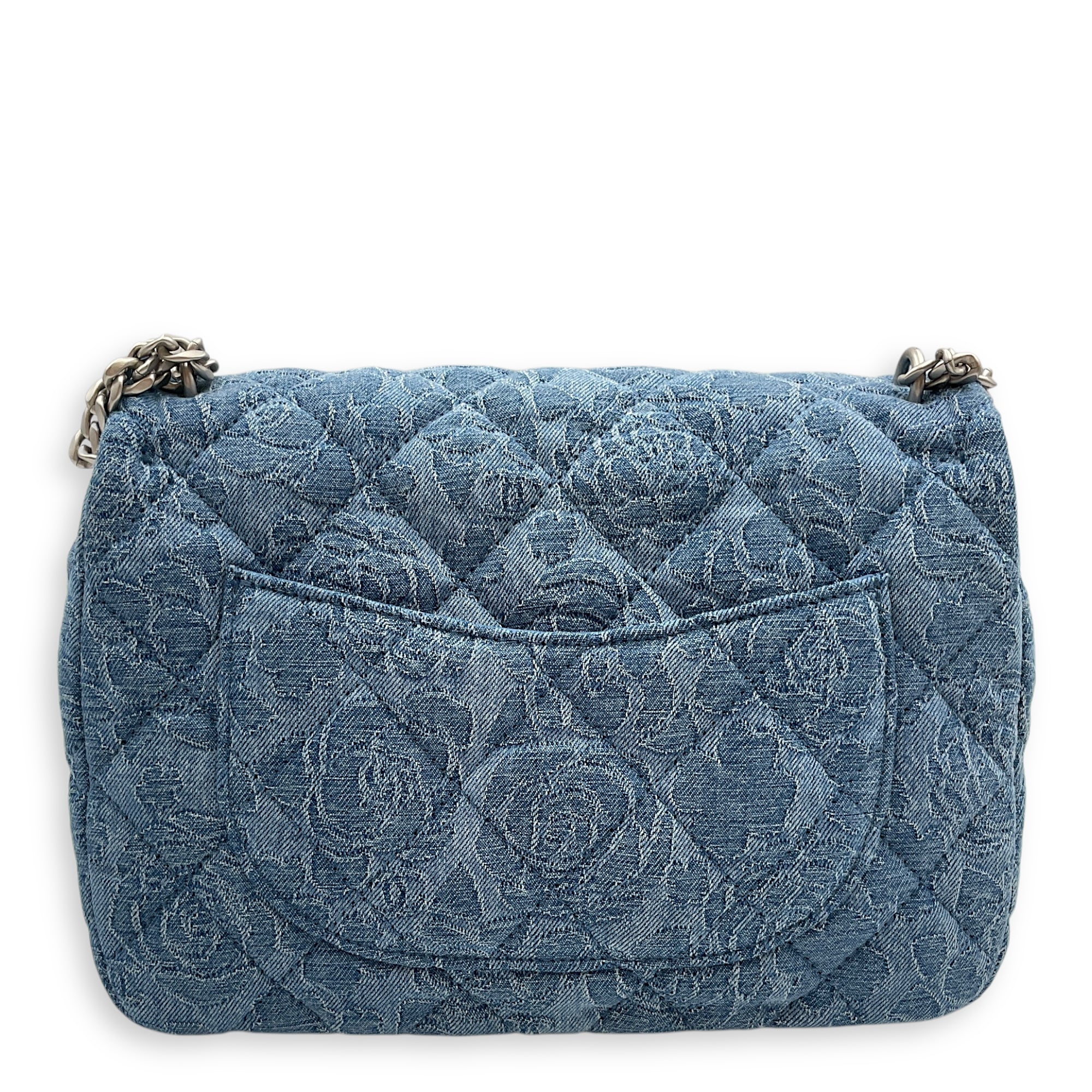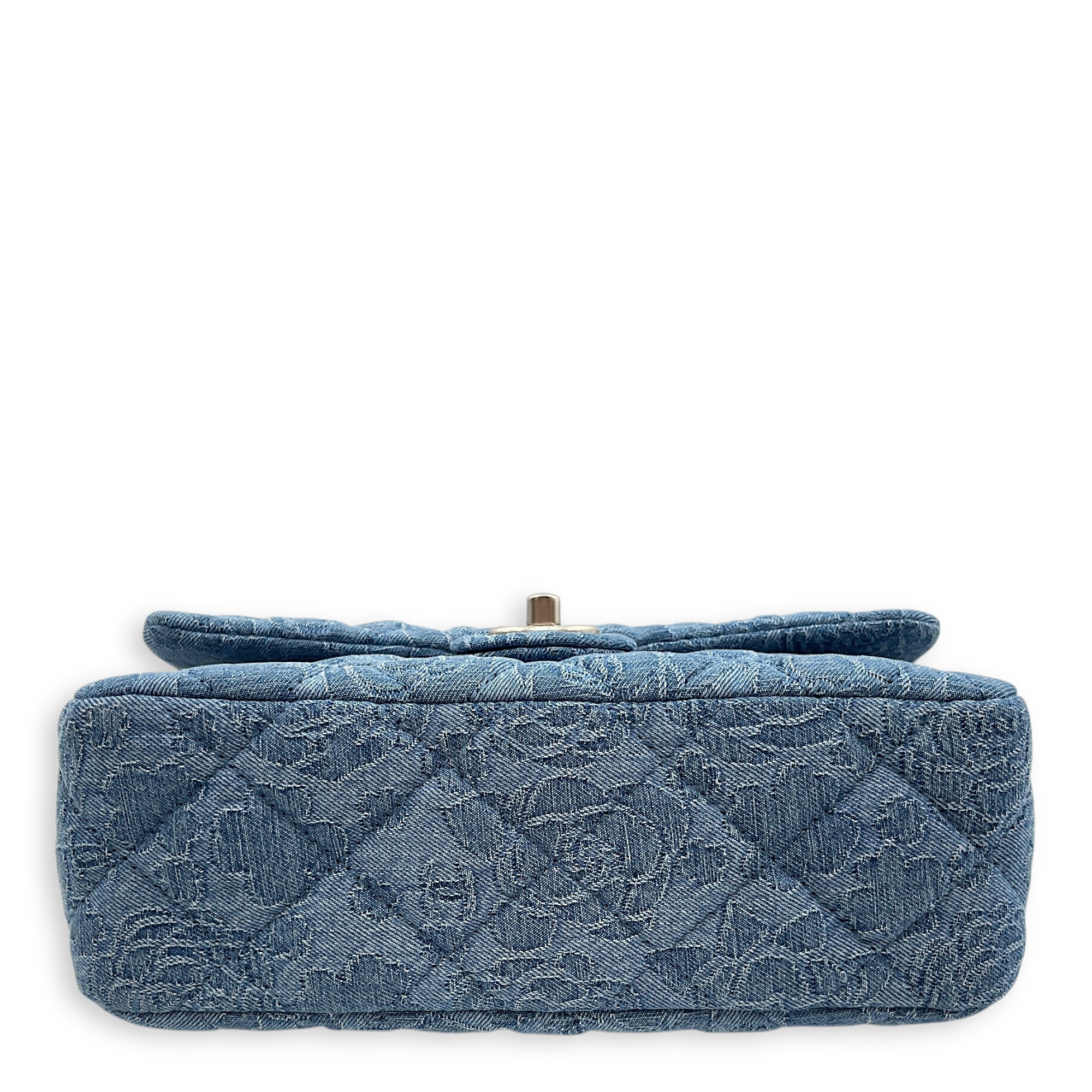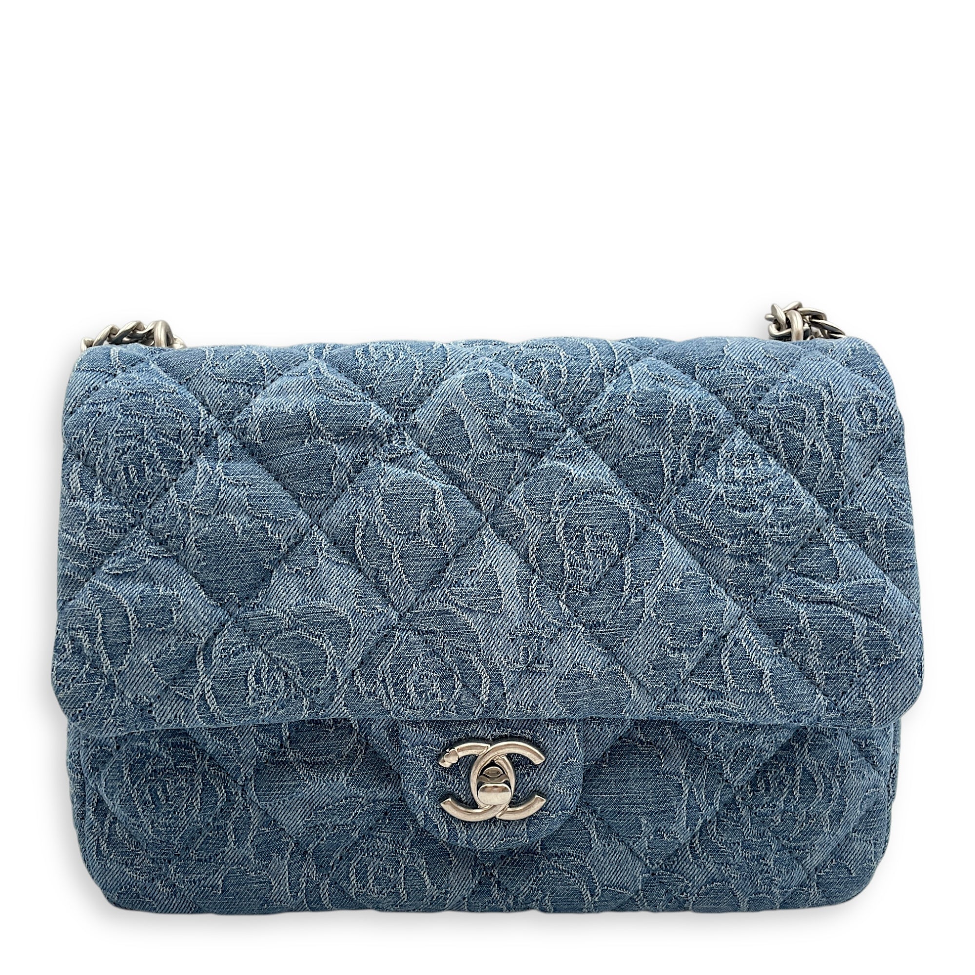 Be the first to review “CC Adjustable Heart Pearl Crush Chain Light Blue Flap Bag in Denim, Silver hardware”