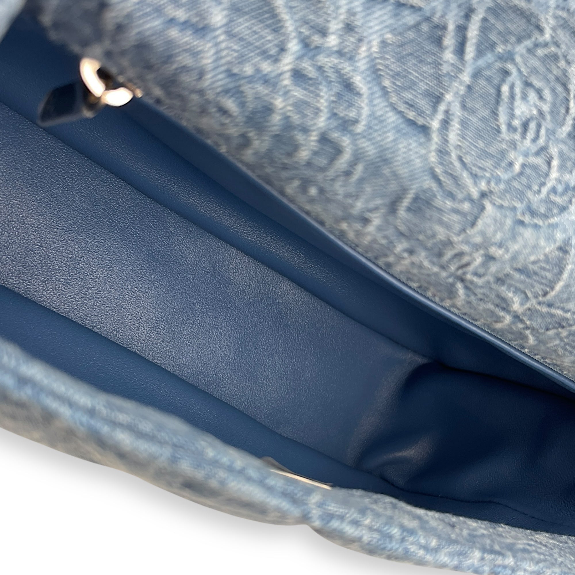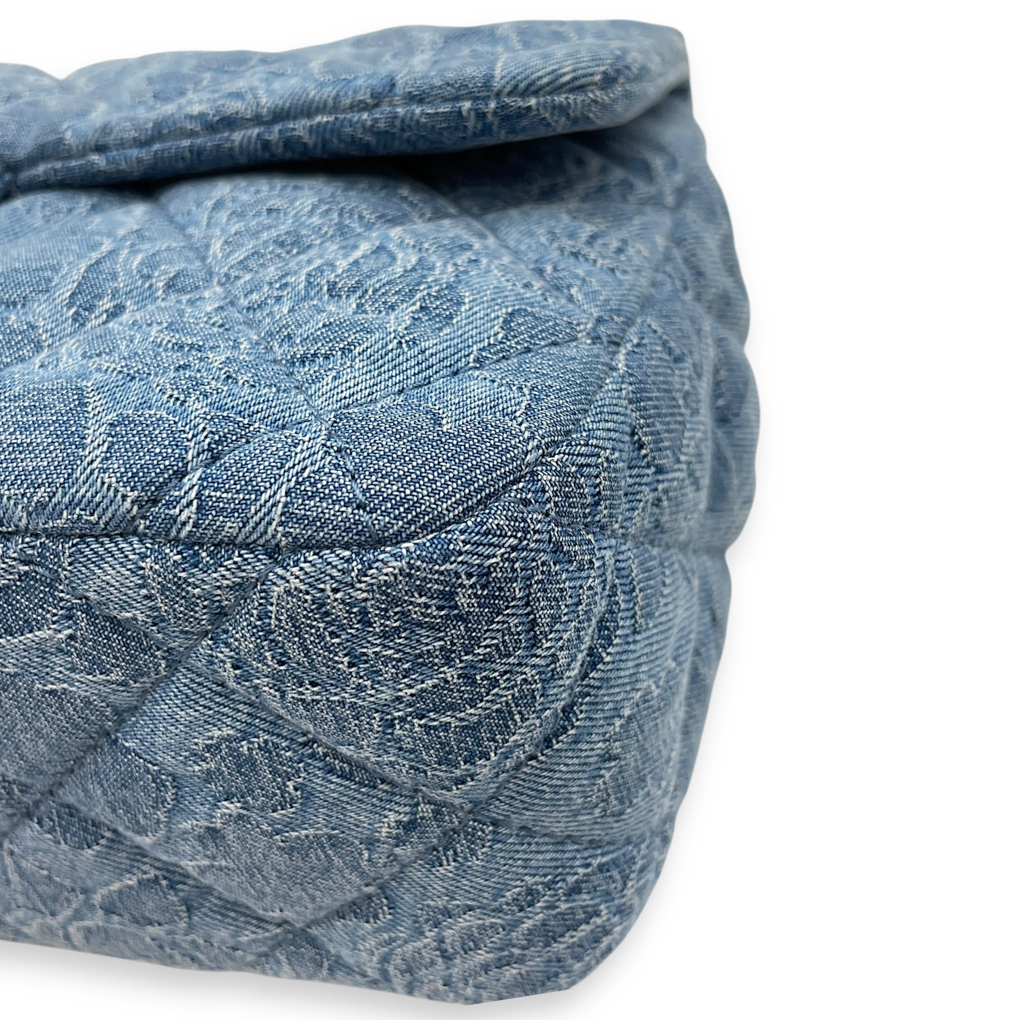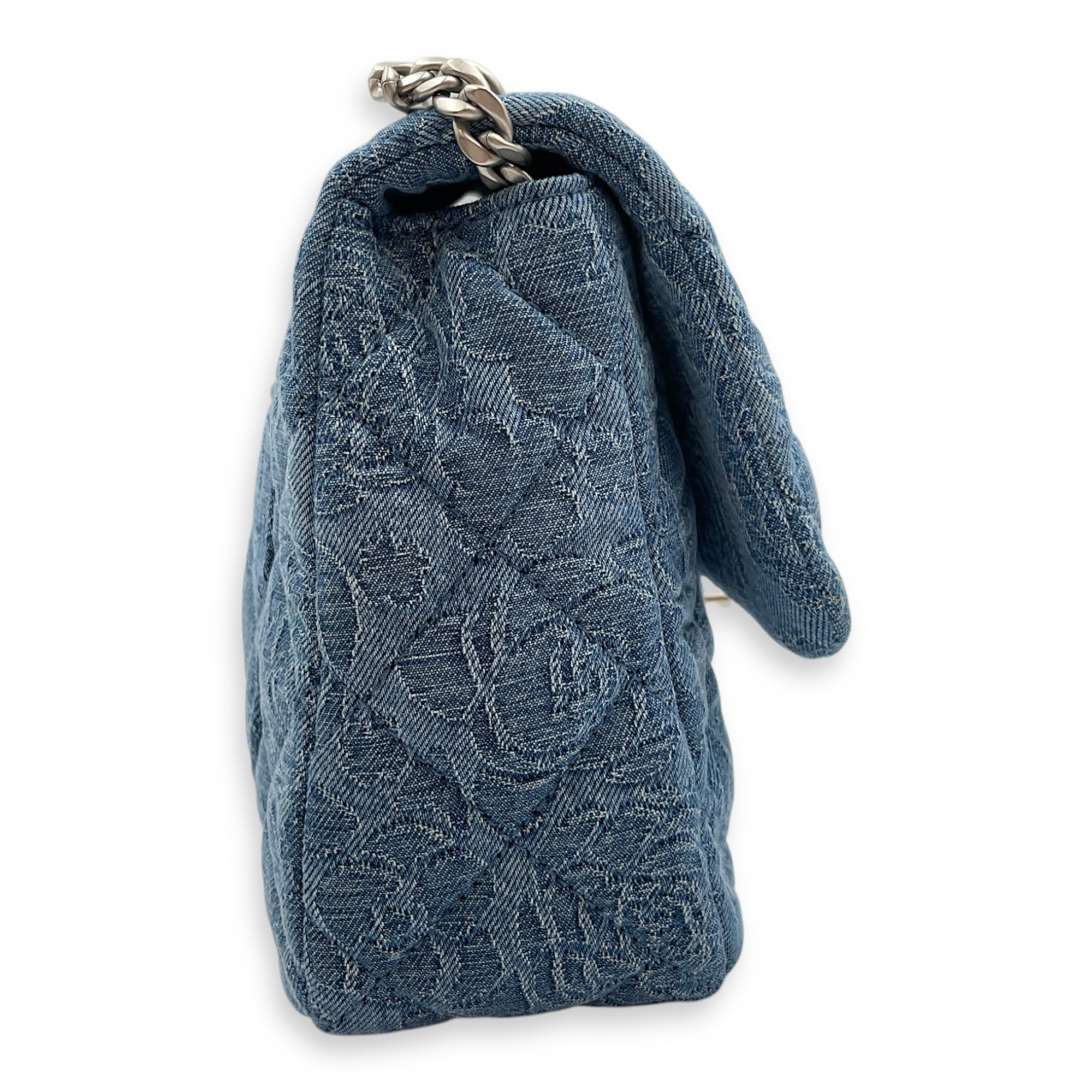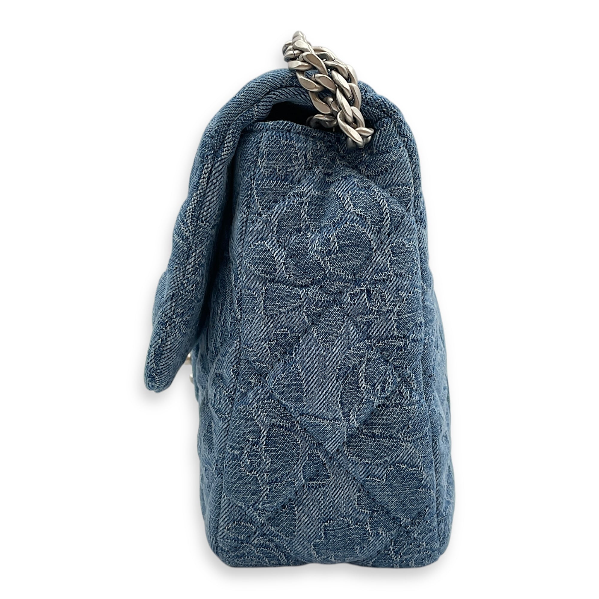Be the first to review “CC Adjustable Heart Pearl Crush Chain Light Blue Flap Bag in Denim, Silver hardware”