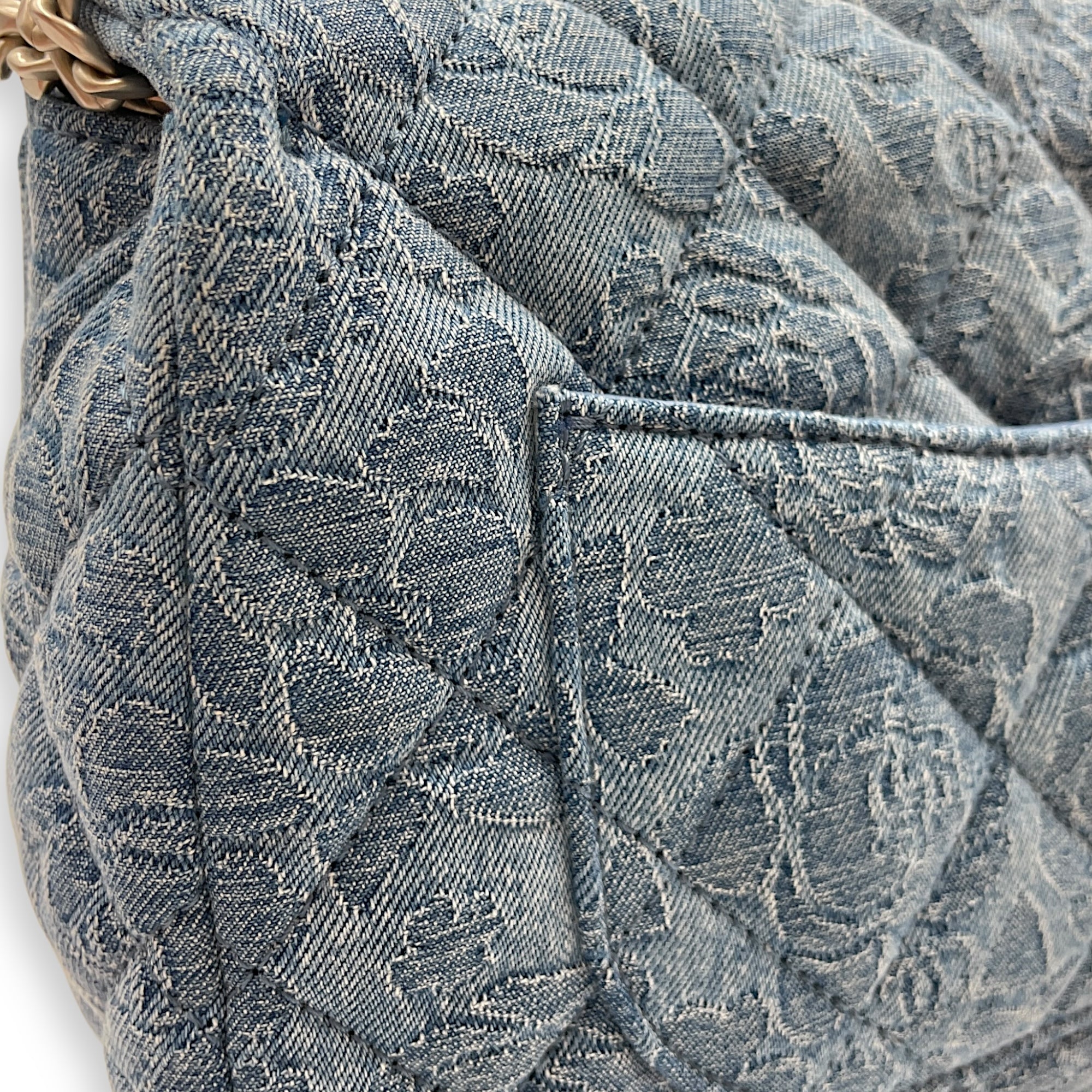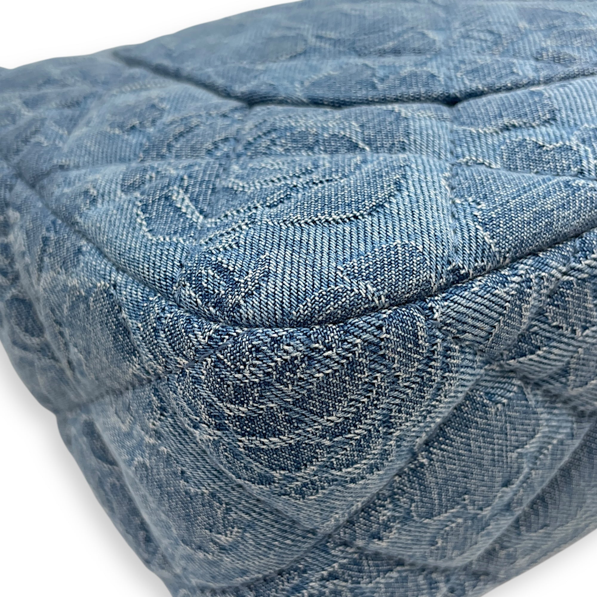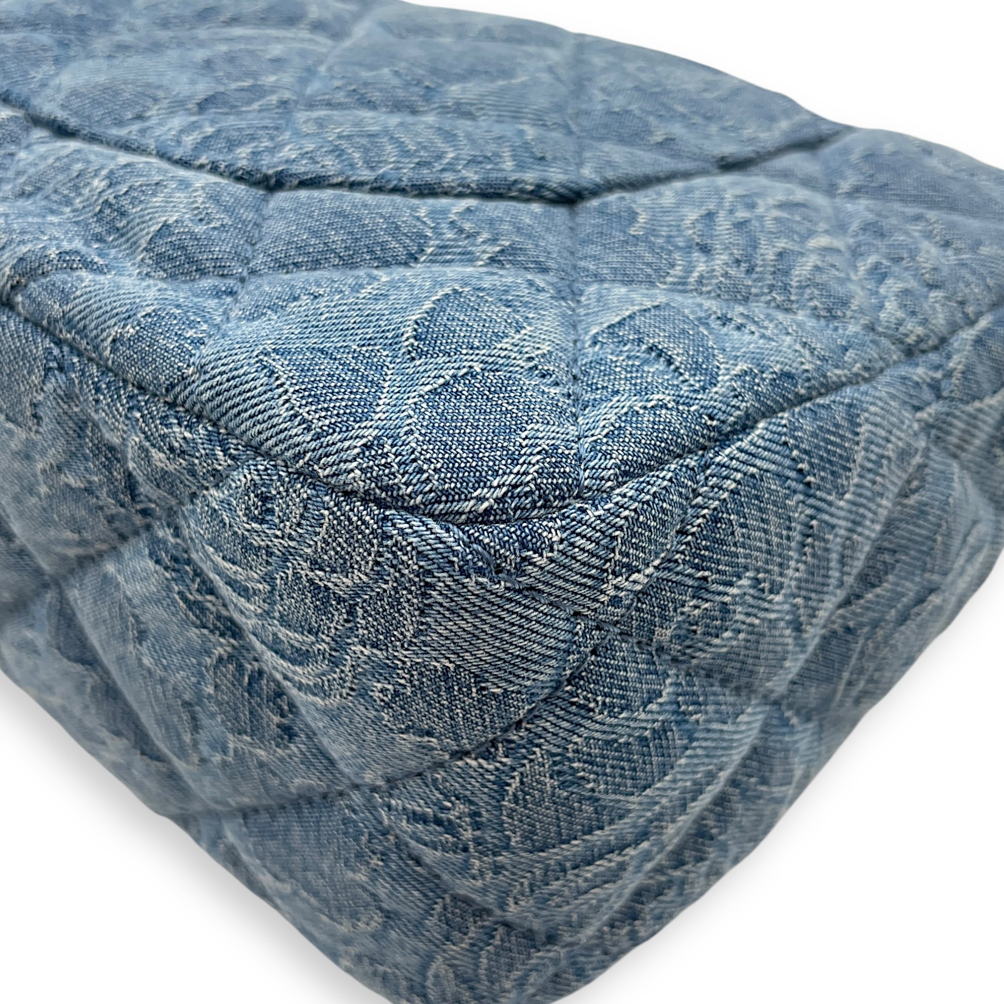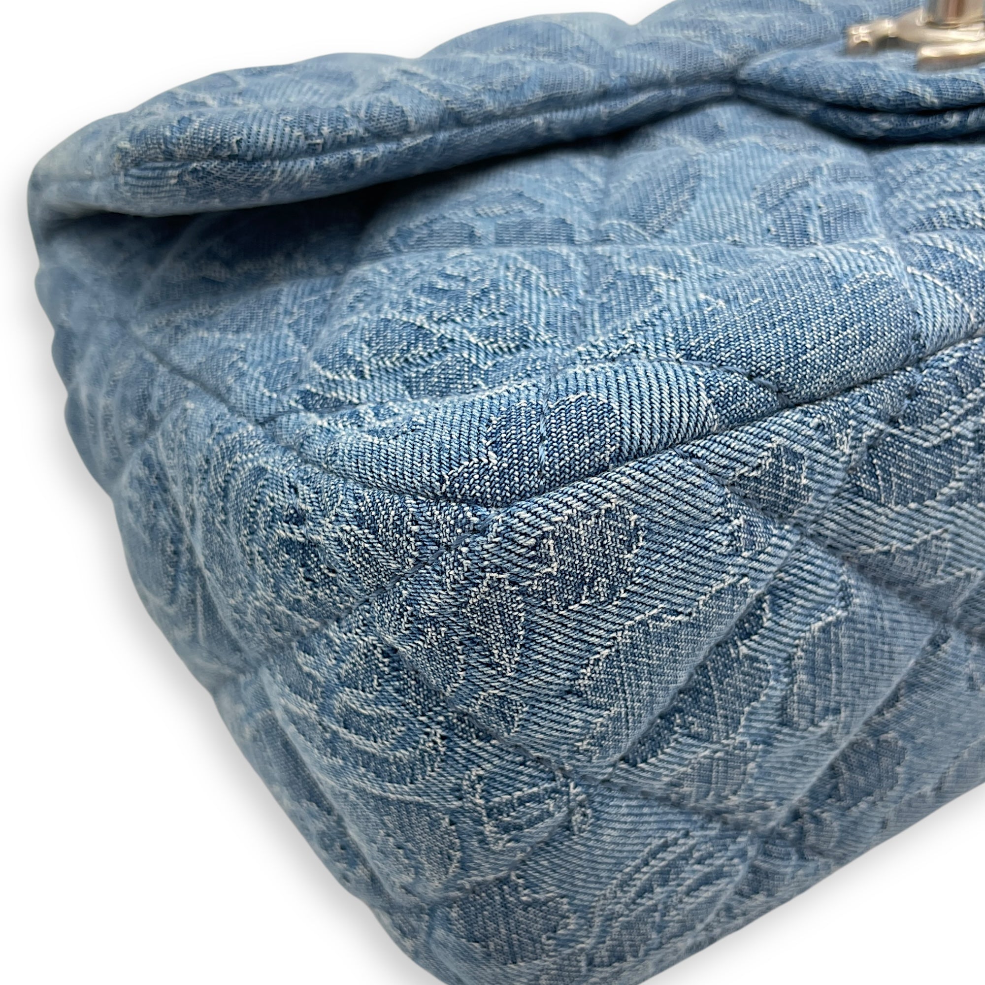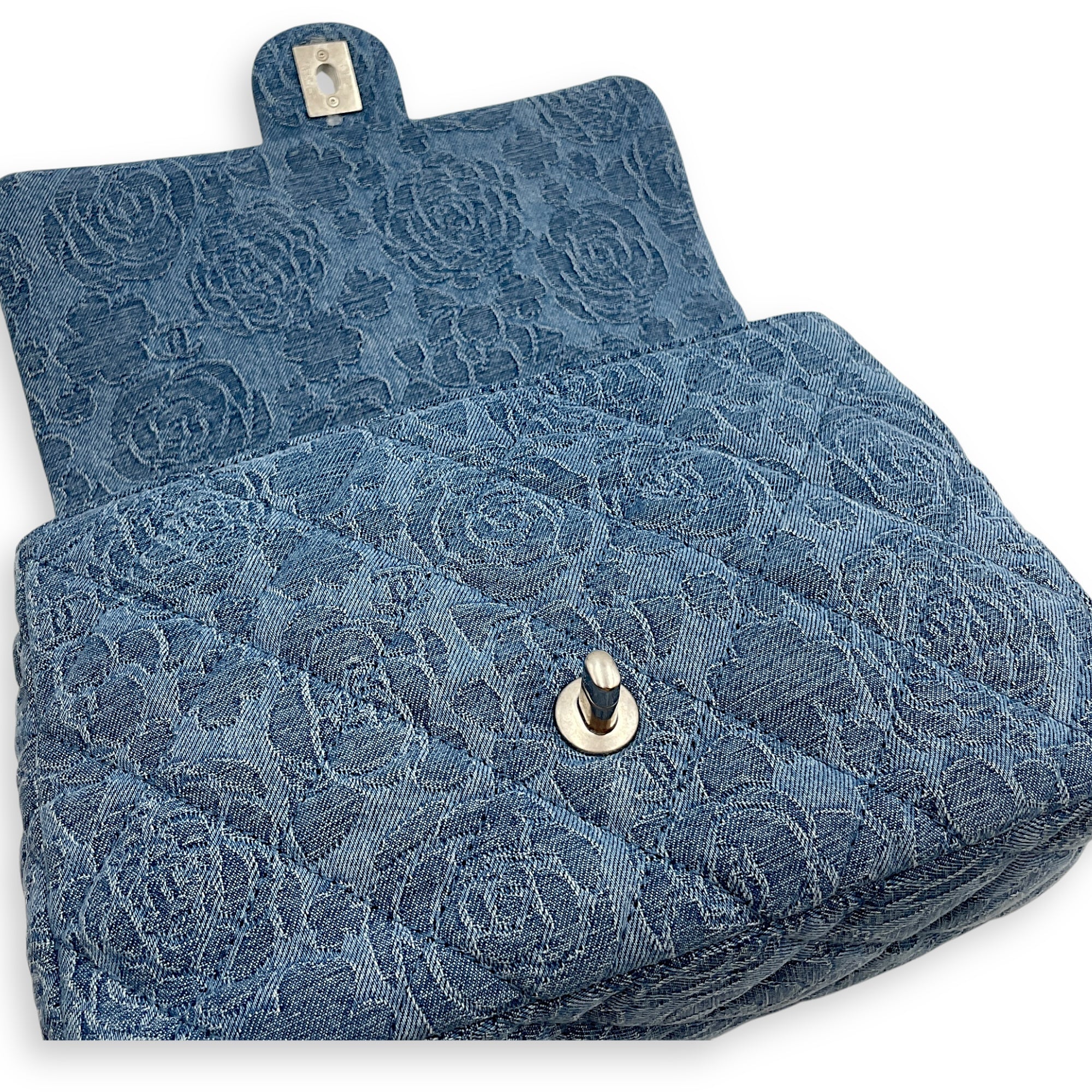 Be the first to review “CC Adjustable Heart Pearl Crush Chain Light Blue Flap Bag in Denim, Silver hardware”