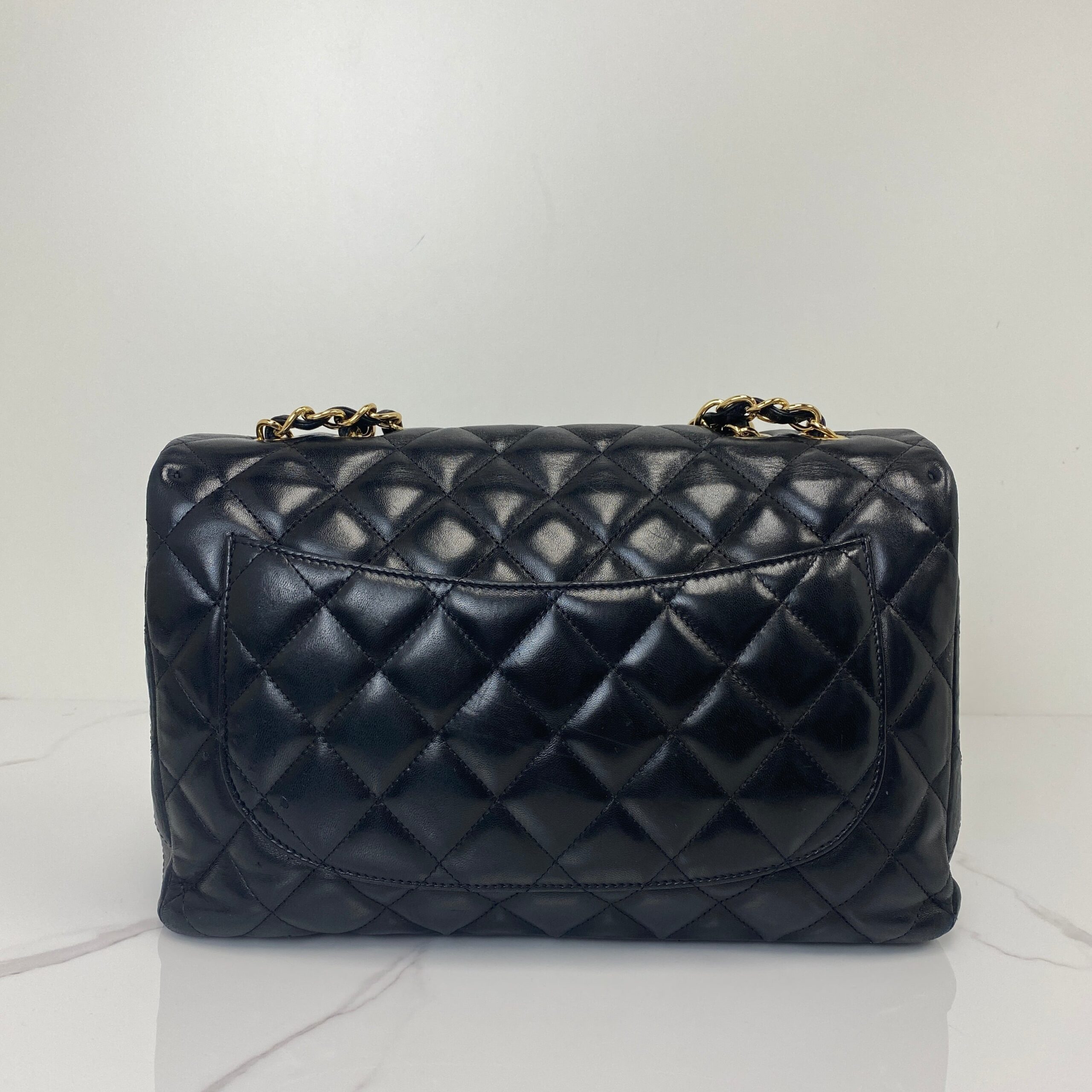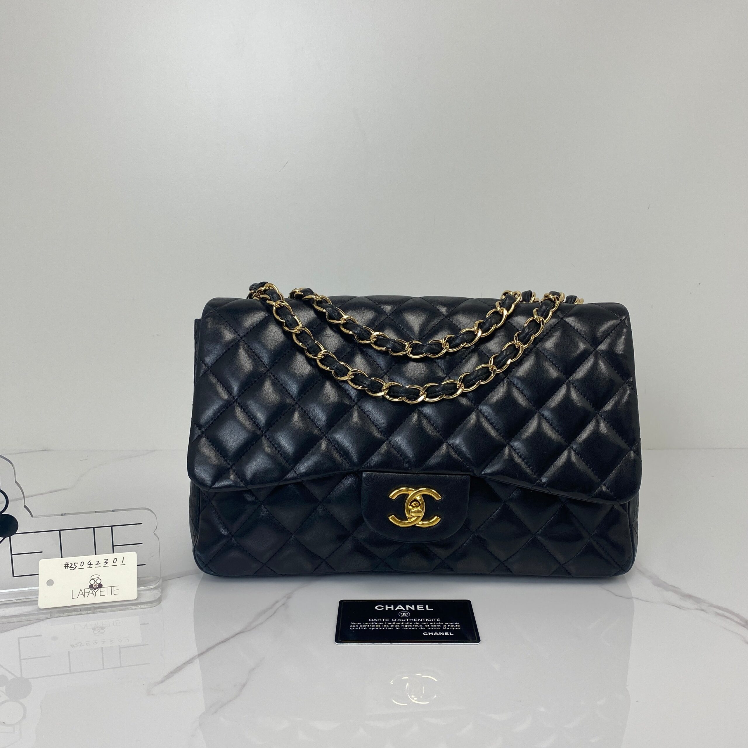 Bold and iconic—the Chanel Jumbo Classic Flap in black lambskin is the ultimate statement of everyday elegance. Perfect with sharp tailoring, cozy knits, or evening glamour.