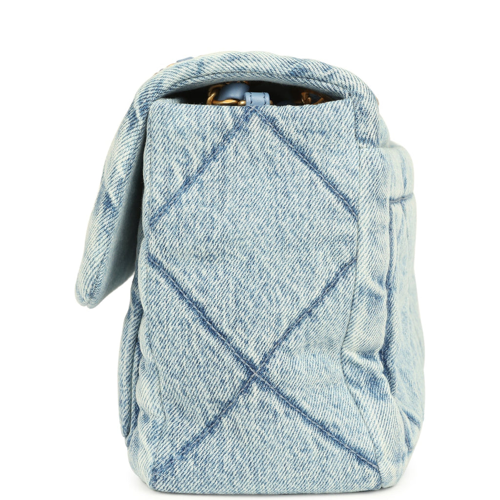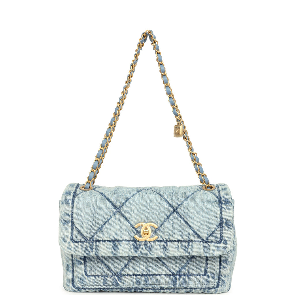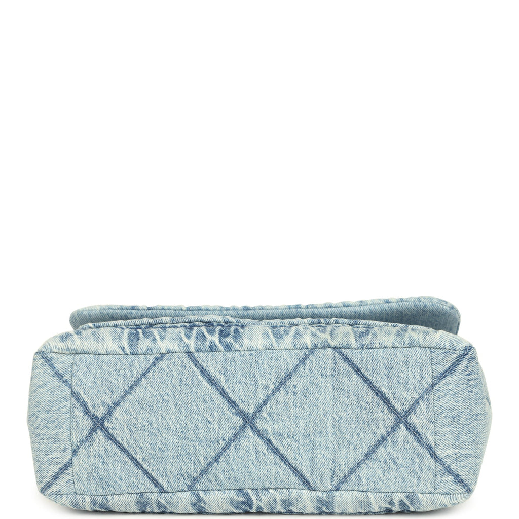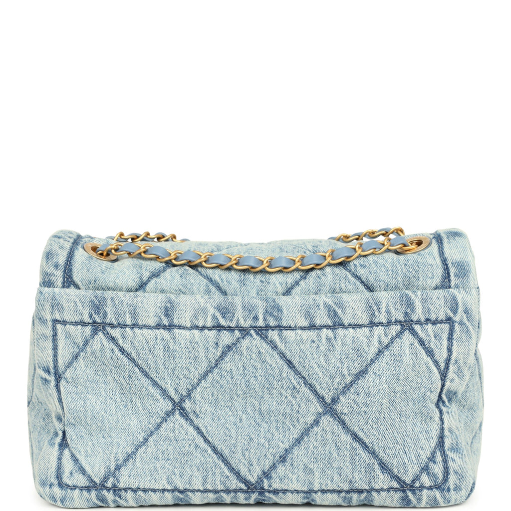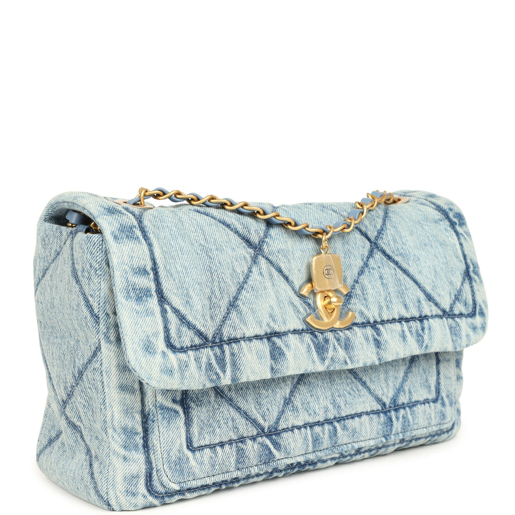 Chanel Large Flap Bag Blue Washed Denim Brushed Gold Hardware Shop for an authentic Chanel Large Flap Bag in blue washed denim with brushed gold hardware in new and never worn condition at Madison Avenue Couture.