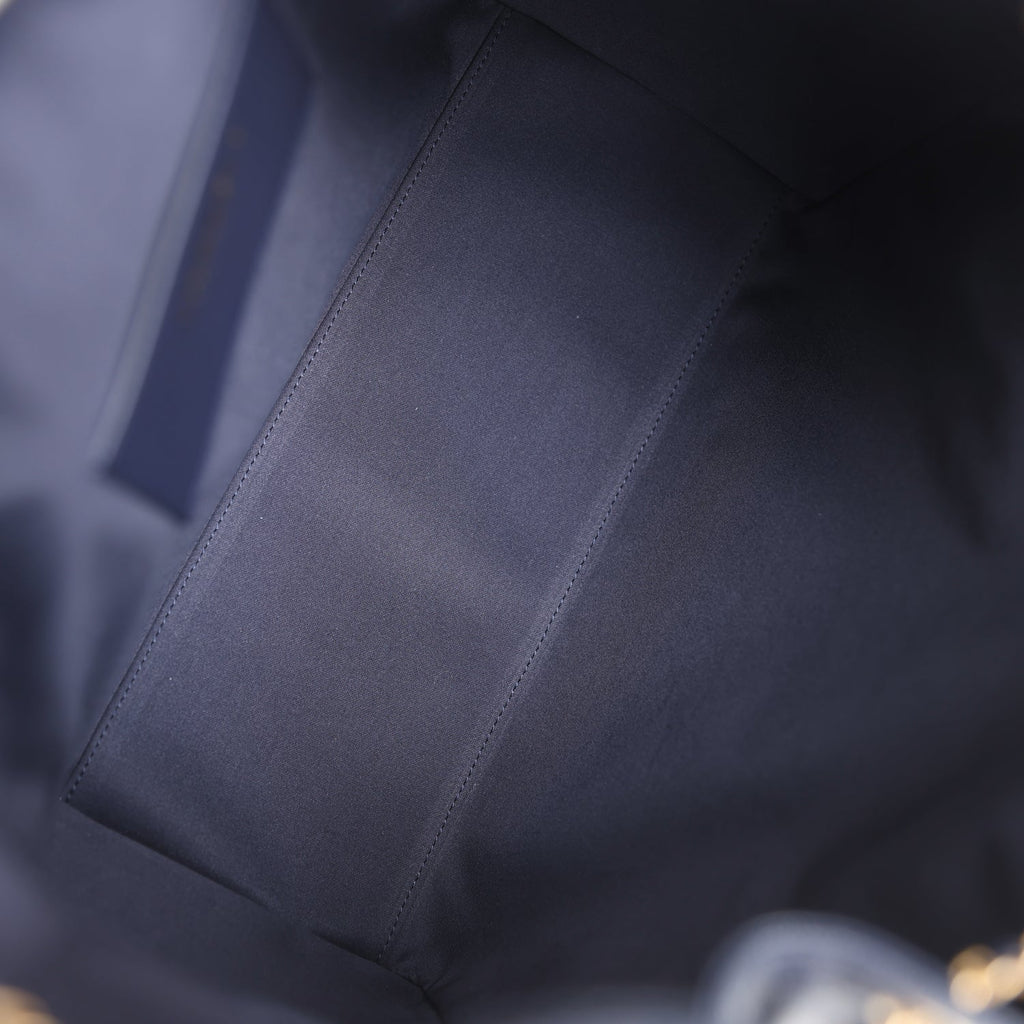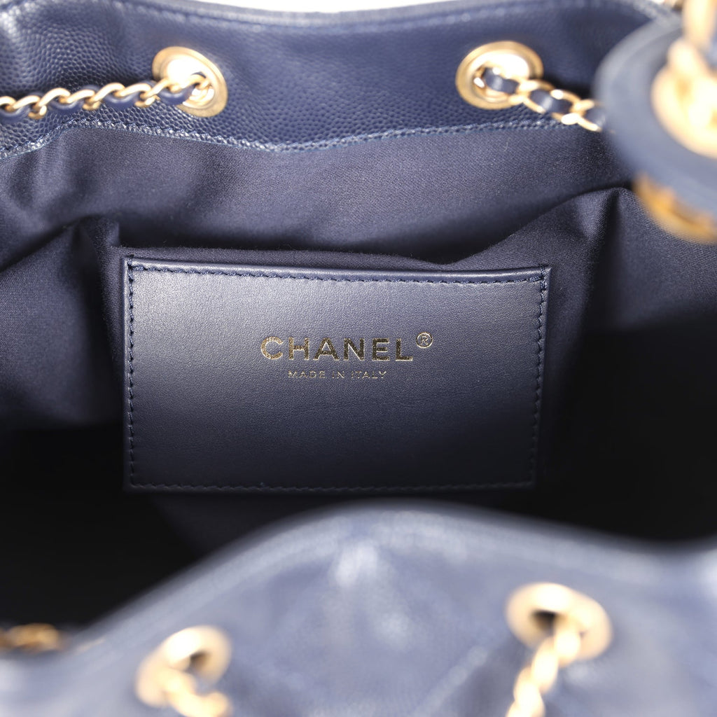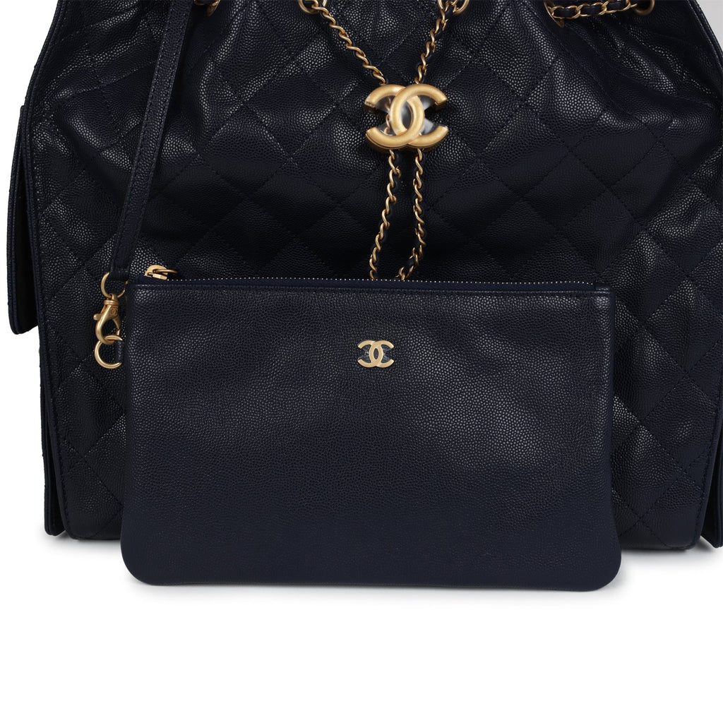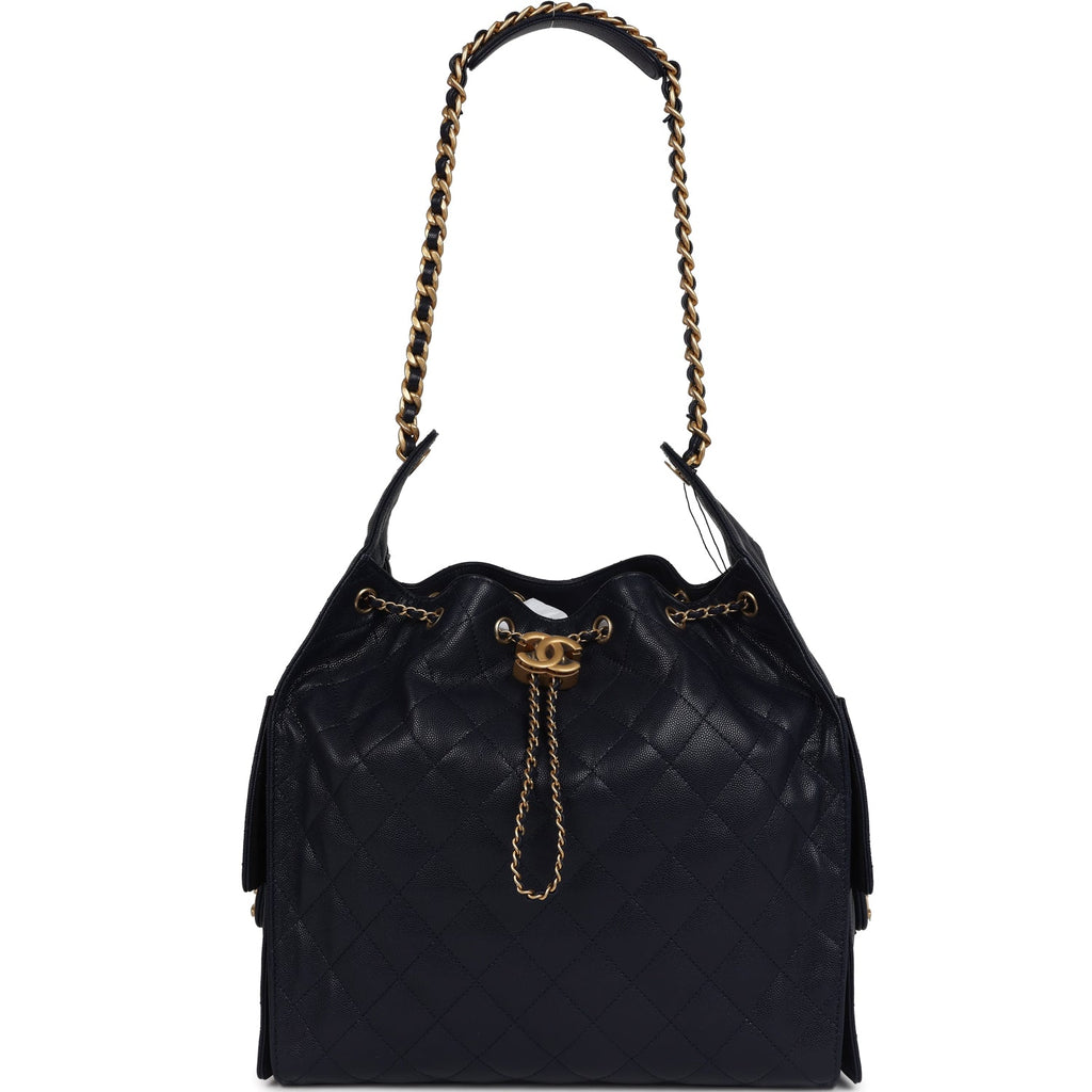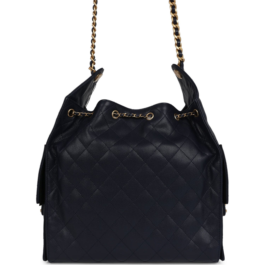 This Chanel Medium 25 Hobo Bag is in dark navy caviar leather with antique gold hardware, features signature diamond quilt, two exterior side pockets, drawstring closure, a removable pouch, and a single interwoven antique gold and dark navy leather shoulder strap.The interior is lined in dark navy grossgrain fabric and has three small slit pockets; one on the rear wall and one slit pocket on each interior side