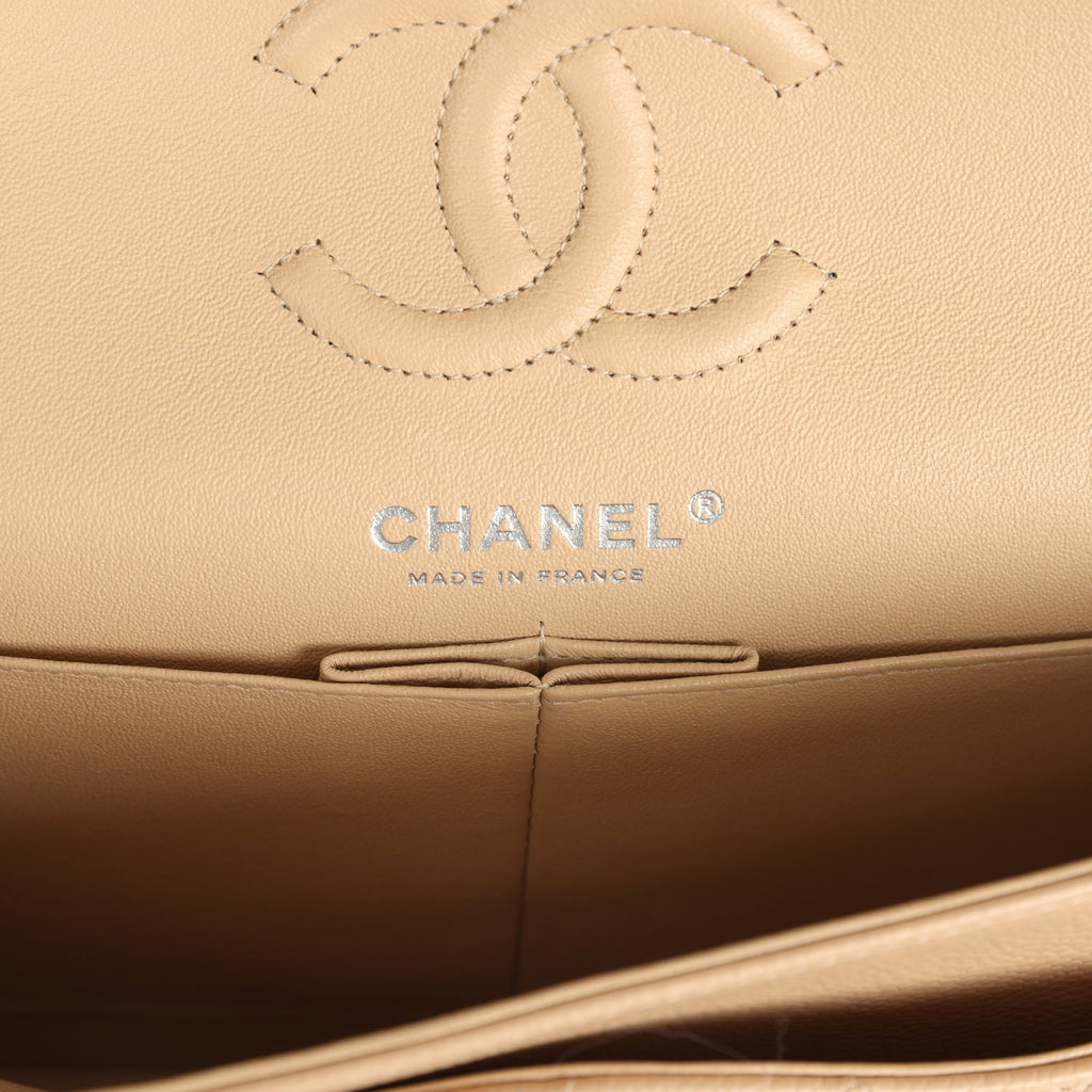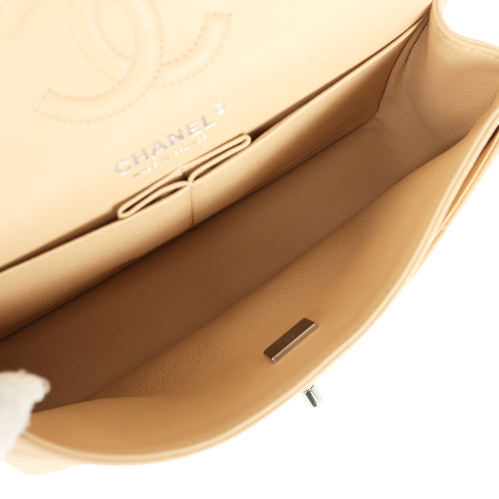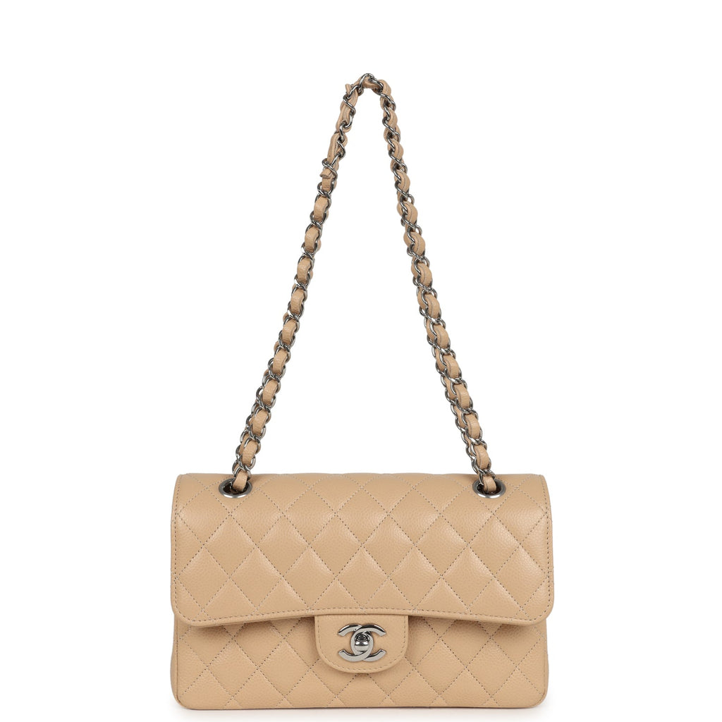 Chanel Small Classic Double Flap Bag Beige Caviar Silver Hardware Shop for an authentic Chanel small classic flap bag of beige caviar leather with silver tone hardware in never worn condition at Madison Avenue Couture.