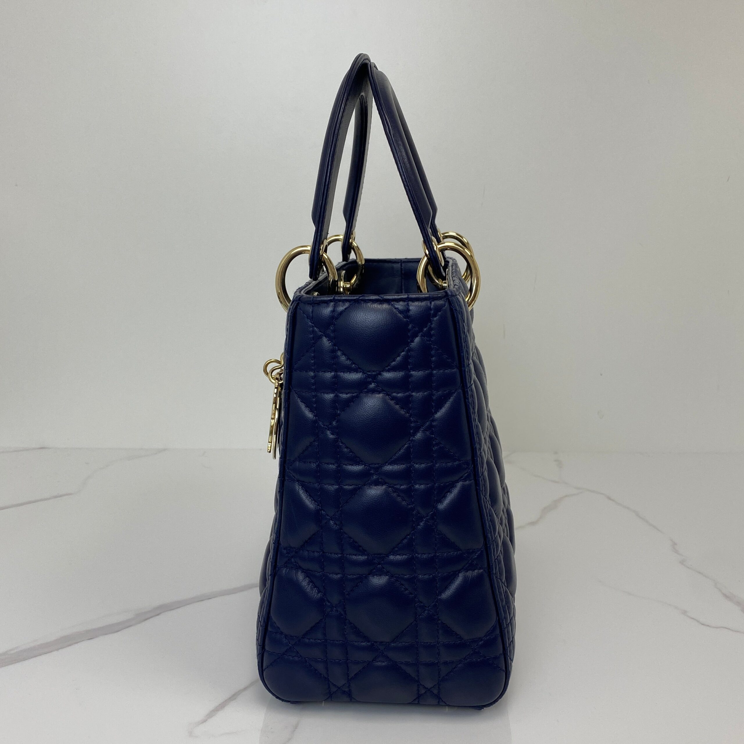 The Christian Dior Medium Lady Dior in lambskin is the embodiment of timeless elegance. Its iconic quilted design and sophisticated silhouette make it a versatile piece, perfect for both day and evening wear. Whether carried by hand or worn with its shoulder strap, this bag effortlessly elevates any ensemble with its classic charm.