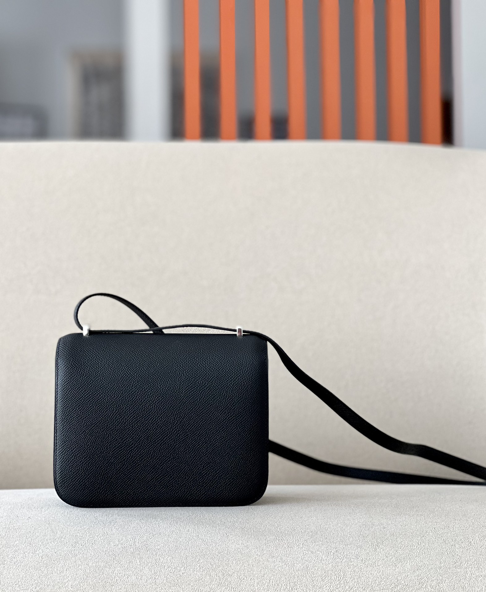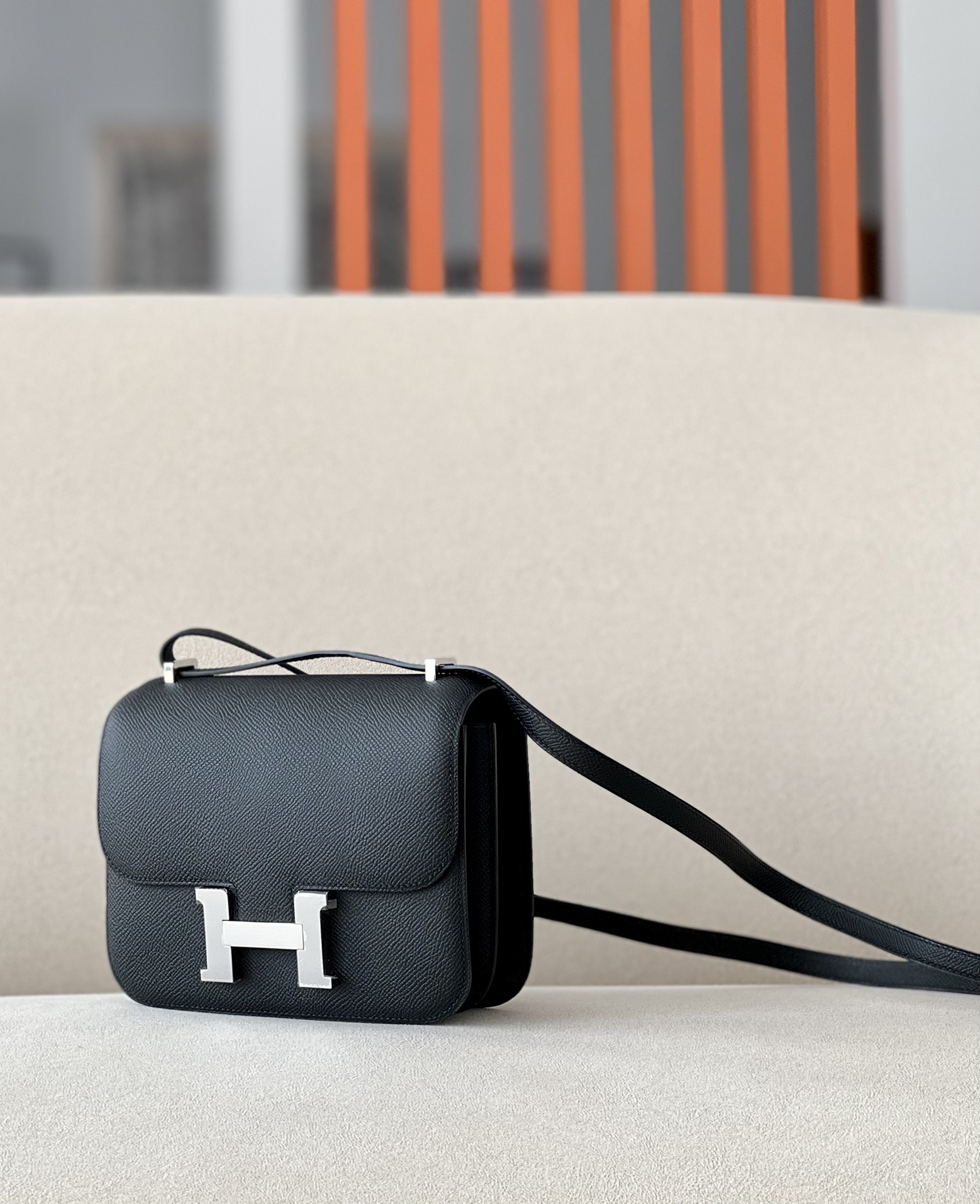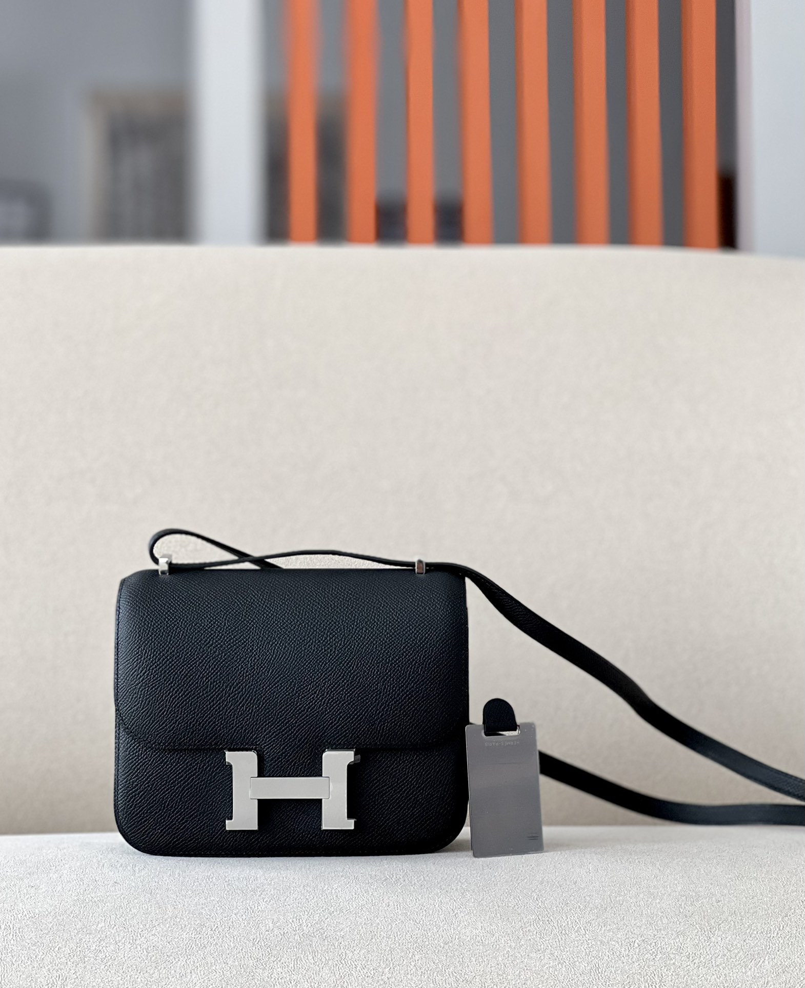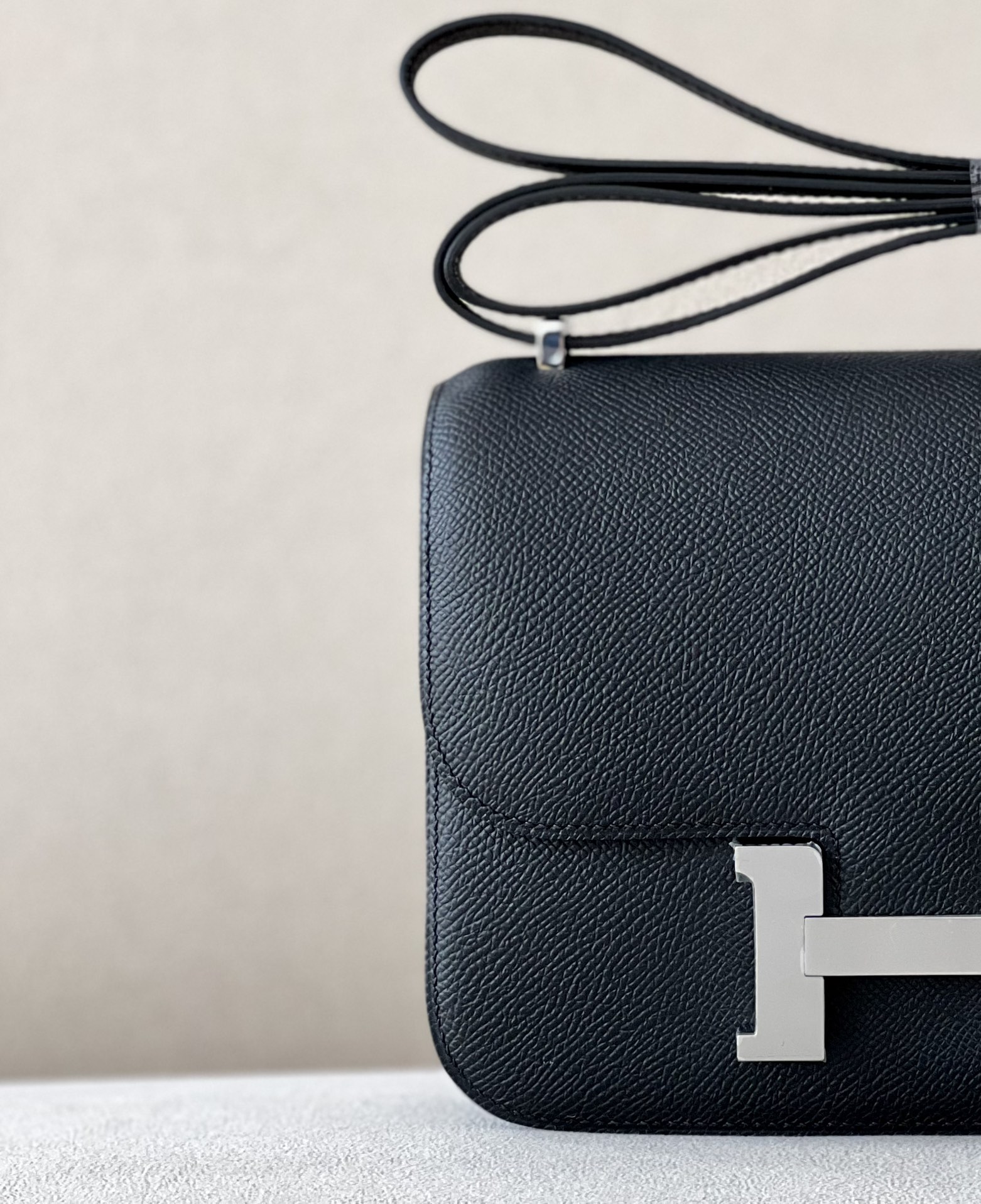 The bag features a long shoulder strap , including an H buckle on the flap.