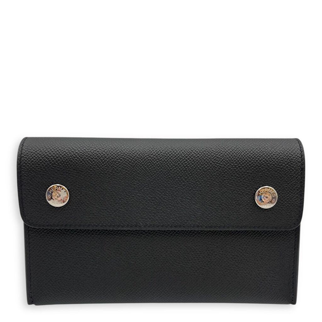 The bag features a long shoulder strap , including an H buckle on the flap.