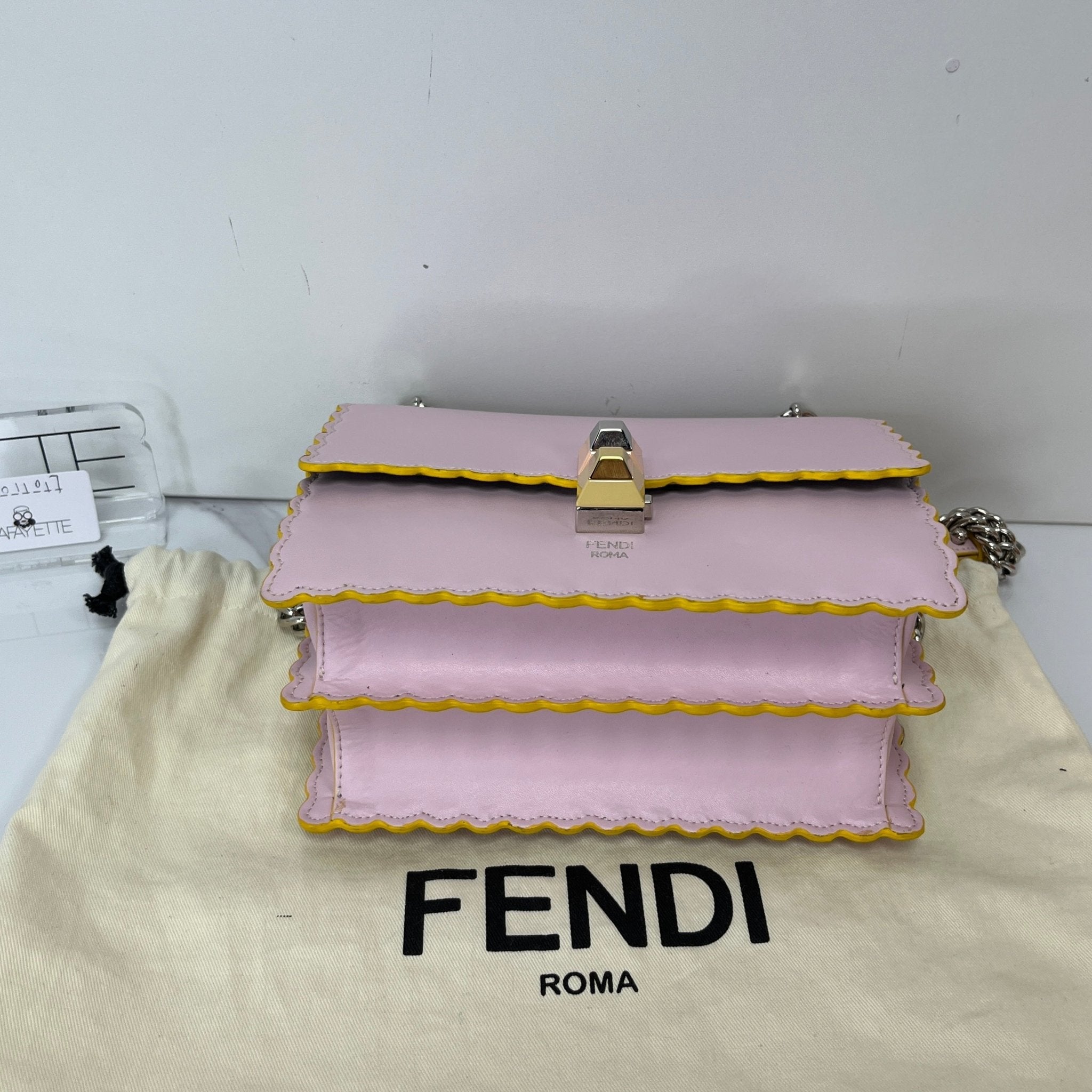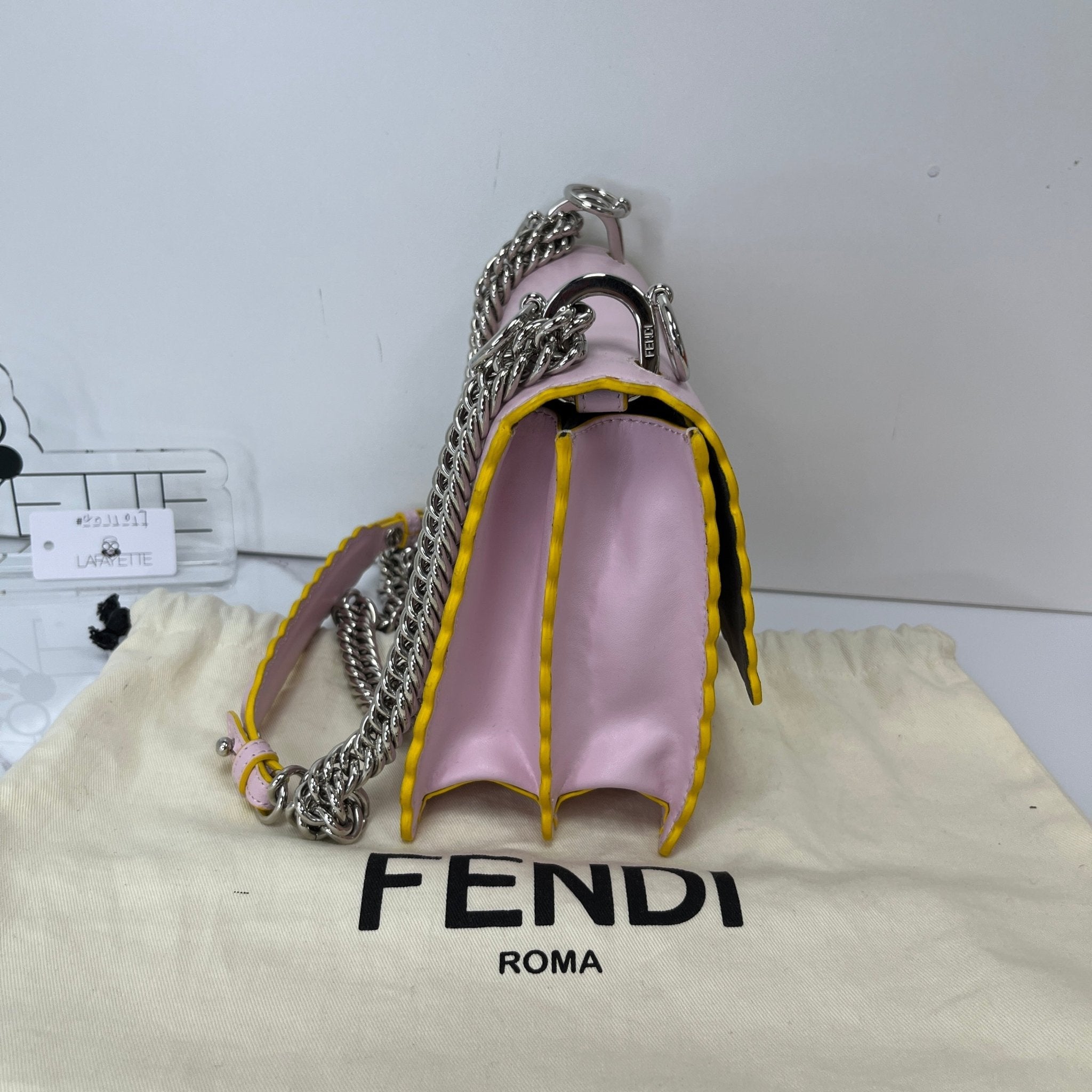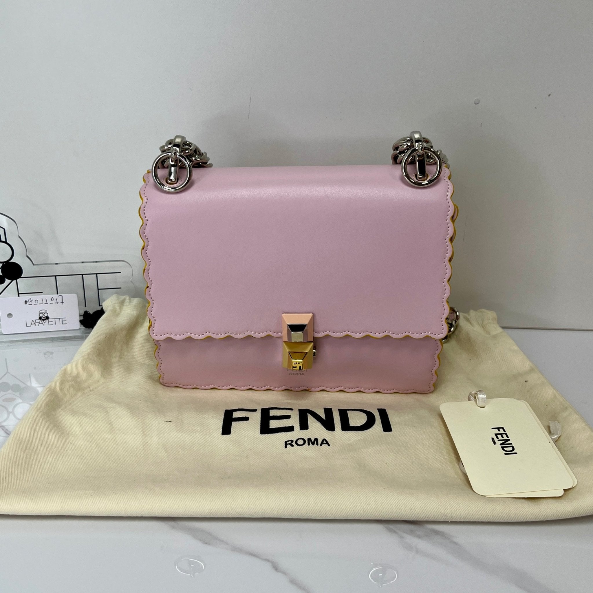 Fendi Kan I – a chic flap bag in a delightful light pink hue, featuring a simple yet sophisticated design. With two compartments inside, it’s perfect for both crossbody and shoulder wear, effortlessly blending fashion and functionality.