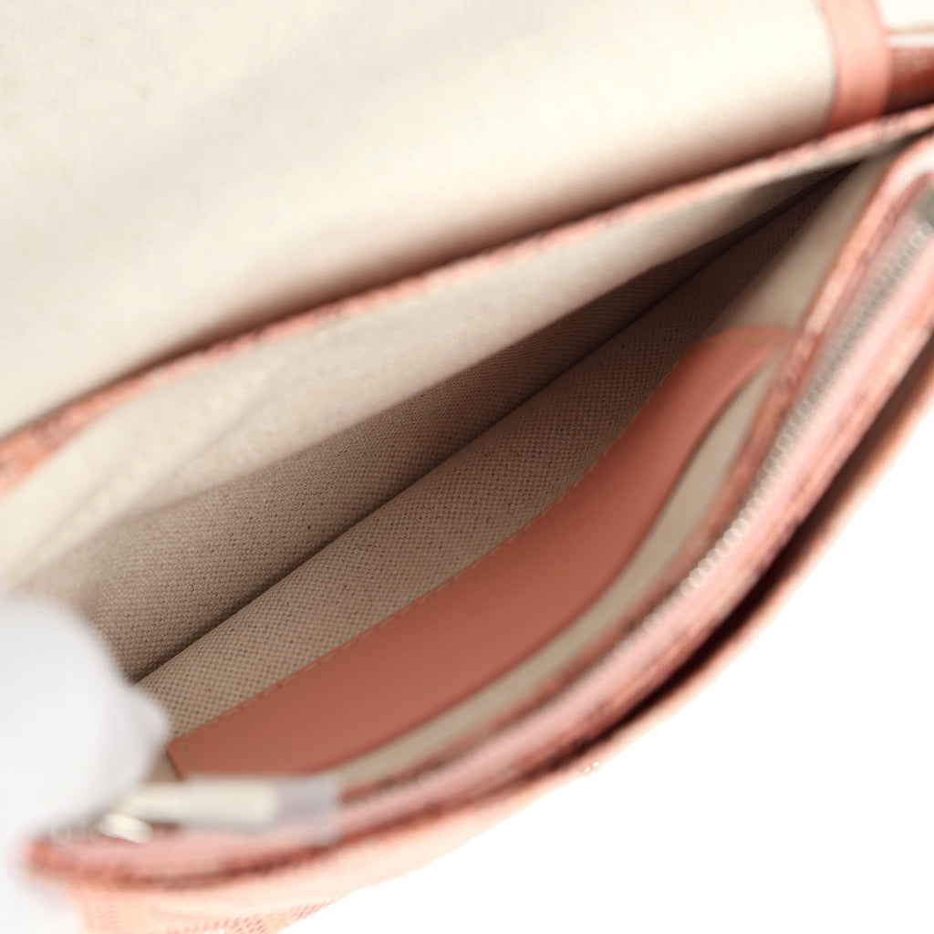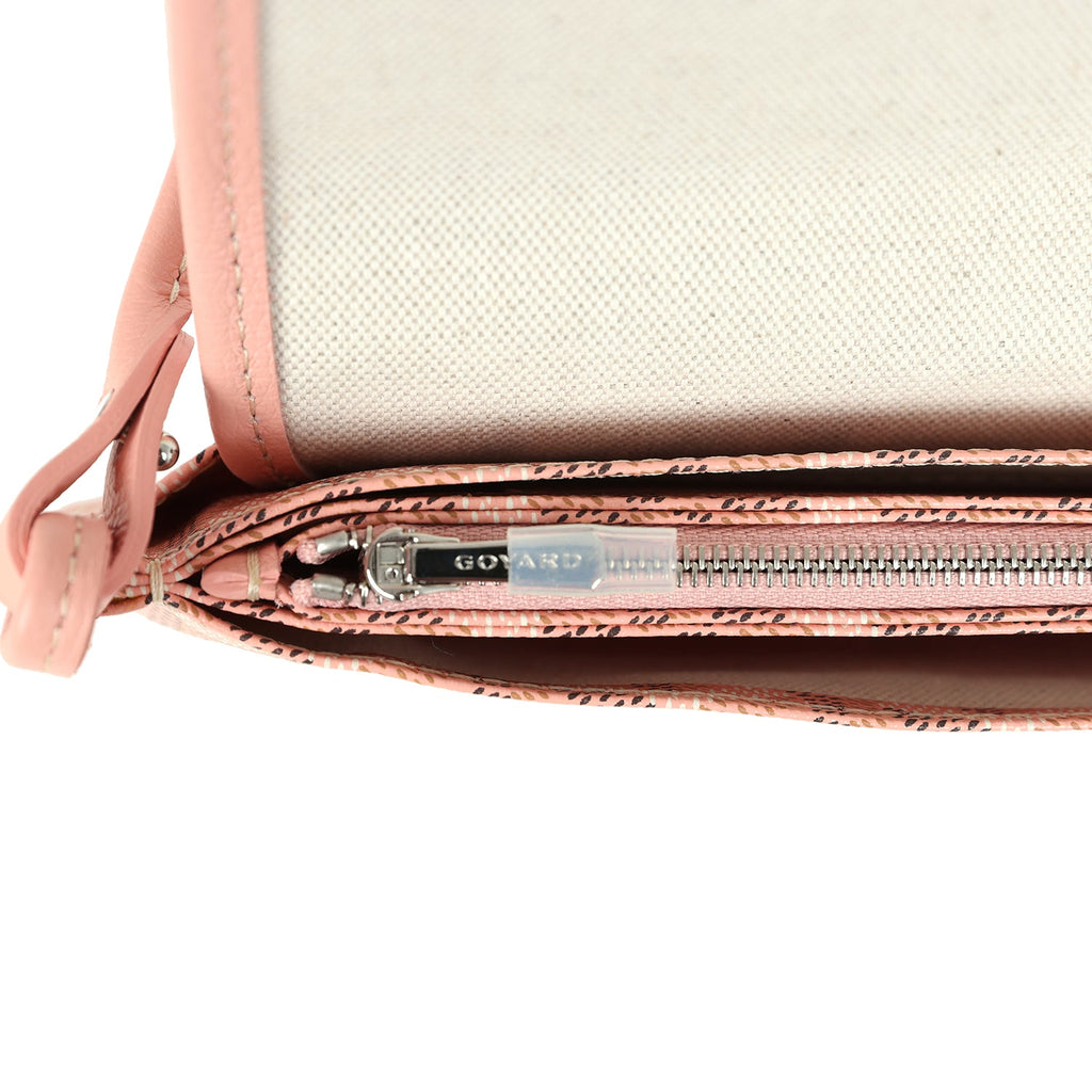 This Goyard Plumet Pocket Wallet is in pink Goyardine canvas and Chevroches calfskin leather with palladium hardware, white contrast stitching, exterior slip pocket, and a detachable crossbody strap.The interior is lined in white canvas with two main compartments, a center zip pocket divide, and two small slip pockets.Origin: FranceCondition: New and never worn Accompanied by: Goyard dustbag, retail UPC, carebookMeasurements: 8” x 5.5″ x 1″; shoulder strap drop: 22″