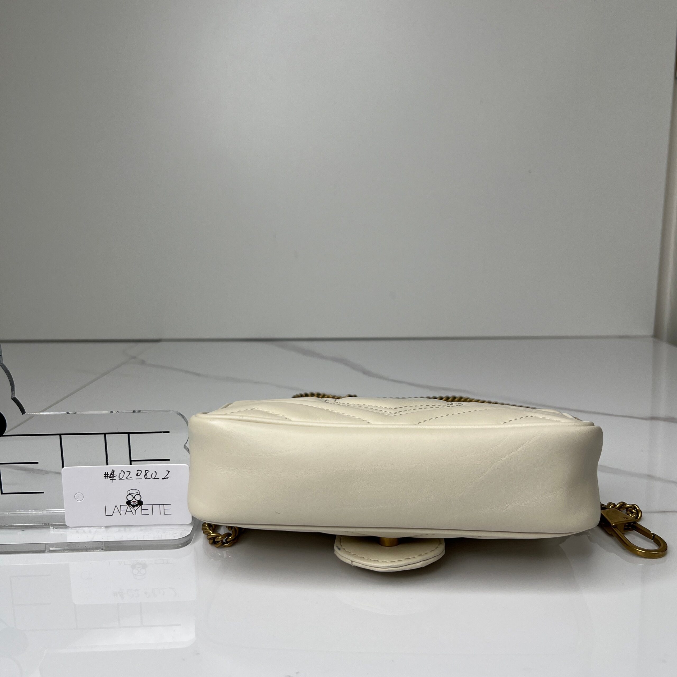 Sling this chic white Gucci Marmont Super Mini over your shoulder for your next night out. Its compact design packs a punch, fitting all your essentials with ease, while its classic style adds a touch of timeless elegance to any outfit.