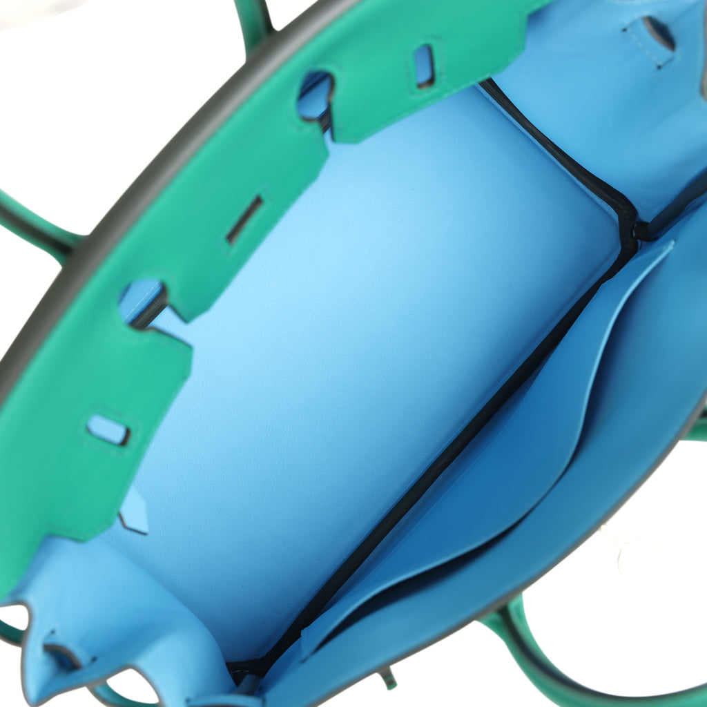 Hermes Birkin 25 Vert Vertigo Verso Swift Palladium Hardware Shop for an authentic Hermes Birkin 25 in Vert Vertigo and Bleu Celeste swift leather with palladium hardware in new and never worn condition at Madison Avenue Couture.