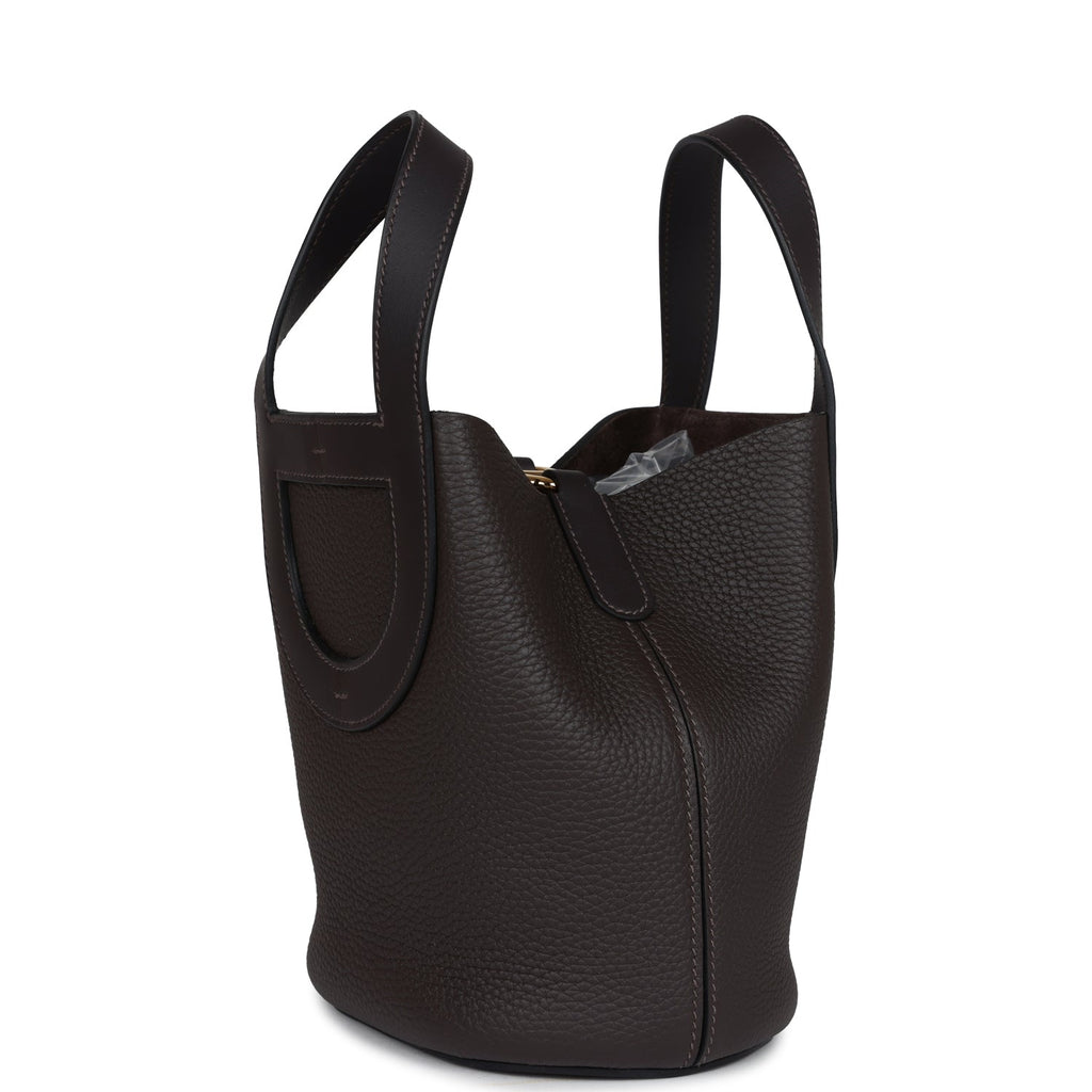 Hermes In-The-Loop 18 Ebene Clemence and Swift Gold Hardware Shop for an authentic Hermes In-The-Loop 18 in Ebene clemence and swift leather with gold hardware in new and never worn condition at Madison Avenue Couture.
