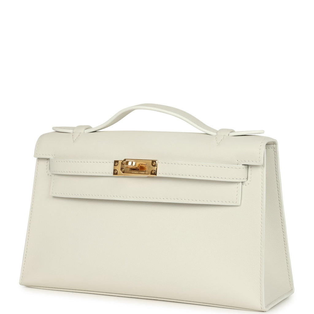 Hermes Kelly Pochette White Swift Gold Hardware Shop for an authentic Hermes Kelly Pochette in White swift leather with gold hardware in new and never worn condition at Madison Avenue Couture.