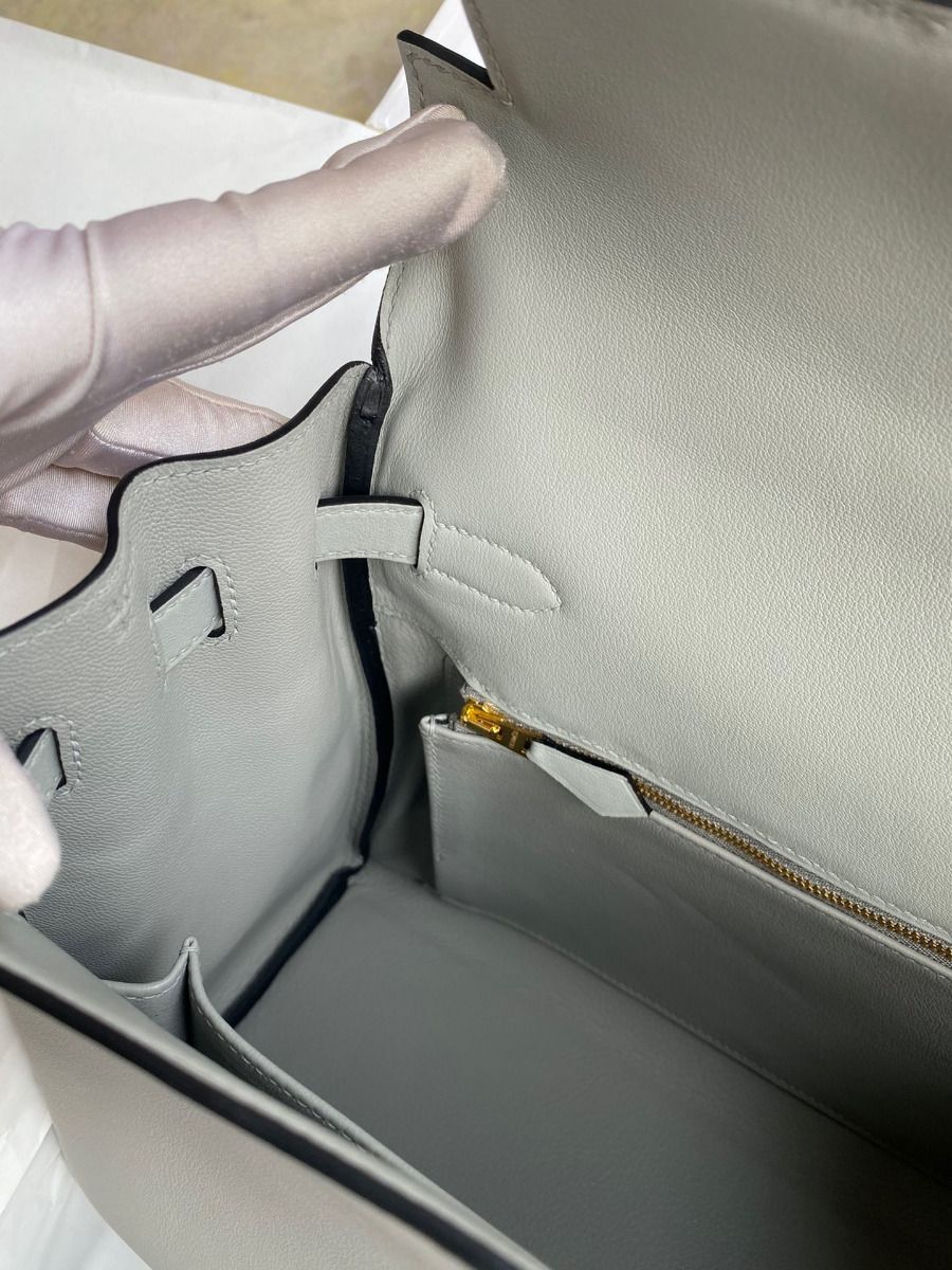 The iconic trapezoid shape of the Hermes Kelly 32 was a striking departure from the ornate handbag styles of the day. The chic look took the world by storm when legendary actress, and crowned princess of Monaco, Grace Kelly was photographed holding her Hermès Sac à Dépêches bag to shield her baby bump from the paparazzi. This Kelly 32 bag in Retourne, a relaxed style made by placing the stitches inside the bag, thanks to the Swift calfskin, which is named after Jonathan Swift, the author of Gulliver’s Travels.