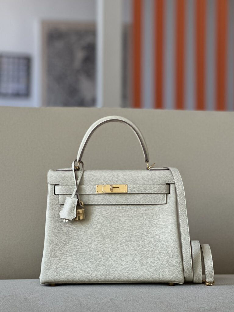 The iconic trapezoid shape of the Hermes Kelly 32 was a striking departure from the ornate handbag styles of the day. The chic look took the world by storm when legendary actress, and crowned princess of Monaco, Grace Kelly was photographed holding her Hermès Sac à Dépêches bag to shield her baby bump from the paparazzi. This Kelly 32 bag in Sellier, a rigid style made by stitching the sides of the bag on the outside, thanks to the precious Ostrich skin, which is extremely durable and can be wiped down if wet to maintain its appearance.