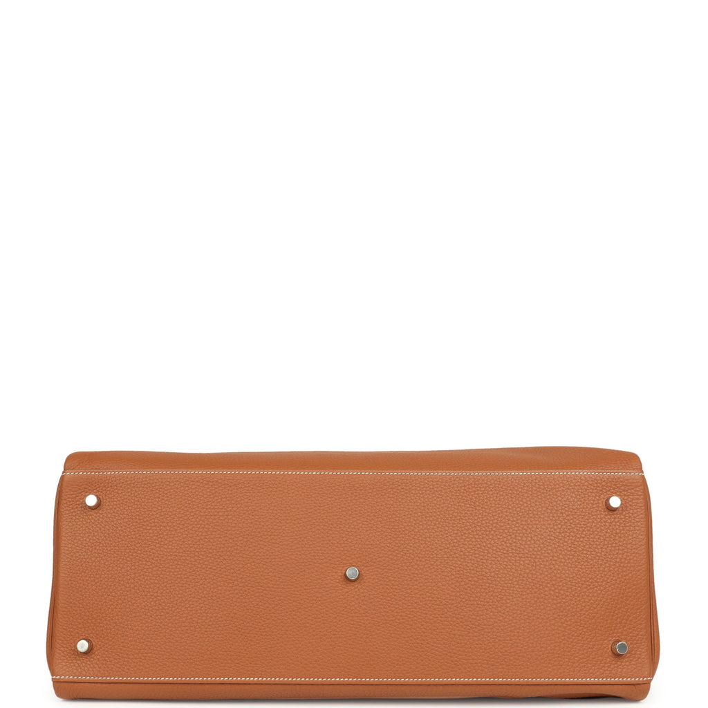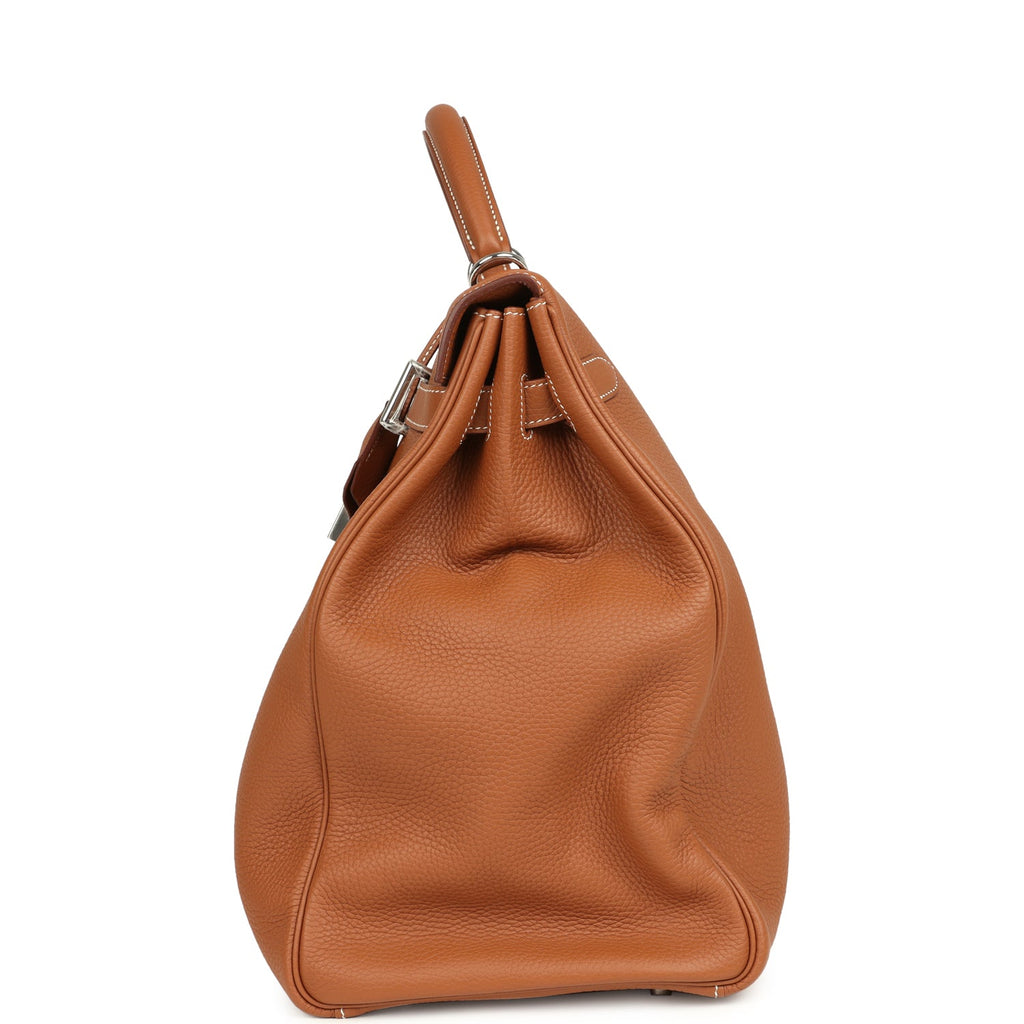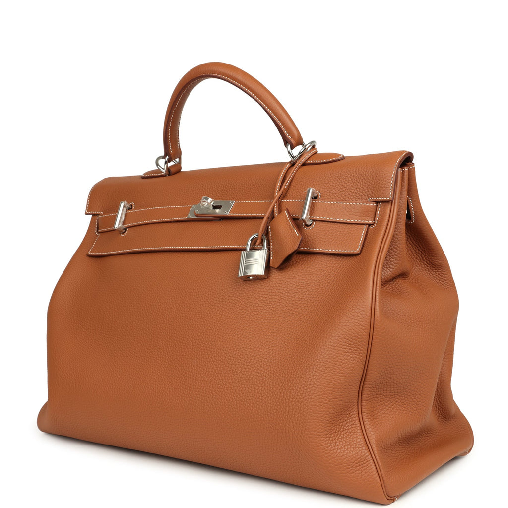 Hermes Kelly Voyage 50 Gold Clemence Palladium Hardware Shop for an authentic Hermes Kelly Relax Voyage 50 in Gold clemce leather with palladium hardware in new and never condition at Madison Avenue Couture.