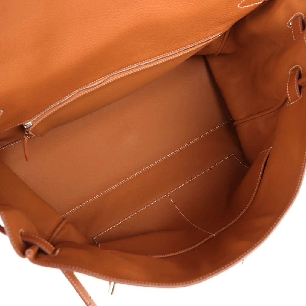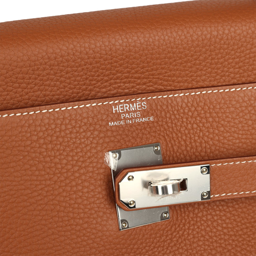 This Kelly Relax Voyage is in Gold clemence leather with palladium hardware and has contrast stitching, two straps with front toggle closure, clochette with lock and two keys, single rolled handle and removable canvas shoulder strap.The interior is lined with Gold swift and features one zip pocket with an Hermes engraved pull and two open pockets on the opposite side.Collection: W (2025)Origin: FranceCondition: New and never worn (plastic on hardware)Accompanied by: Hermes box, Hermes dustbag, felt, clochette, lock, two keys, clochette dustbag, removable shoulder strap, shoulder strap dustbag, carebook, ribbonMeasurements: 19.5″ width x 14″ height x 8.75″ depth; 4.5″ handle drop (16.5″ shoulder strap drop)