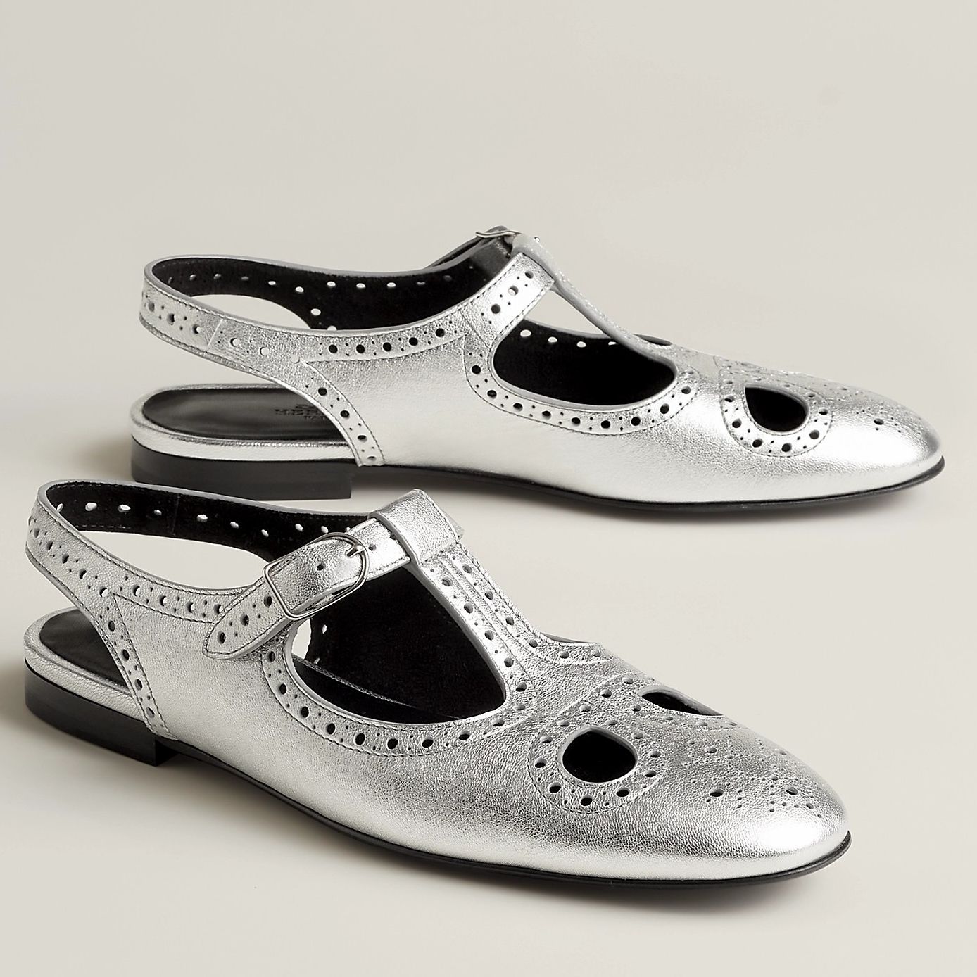 Be the first to review “Hermes Kim Slingbacks in Silver Ghillies Metallic Leather”