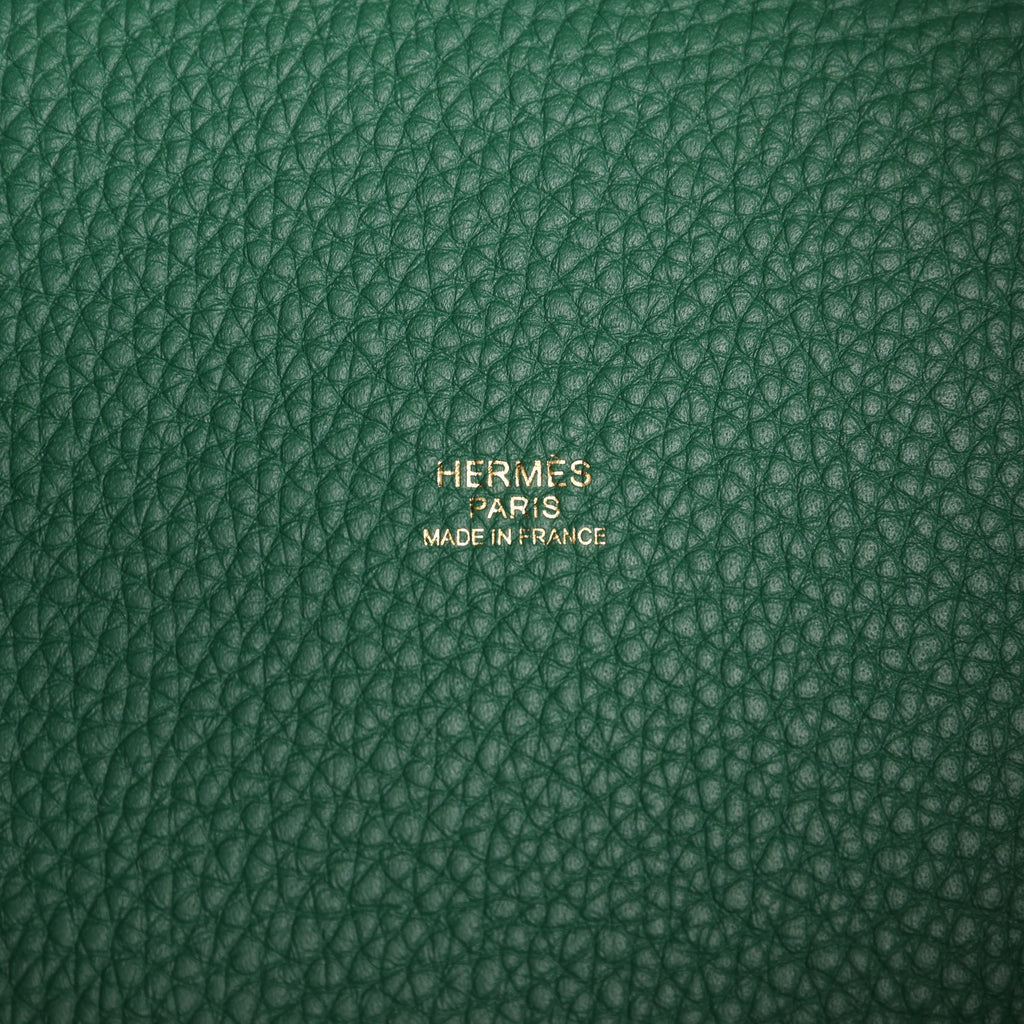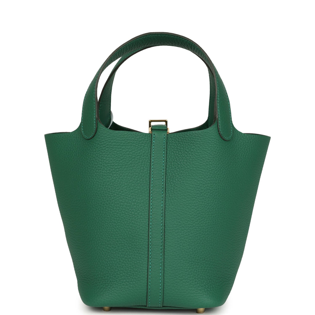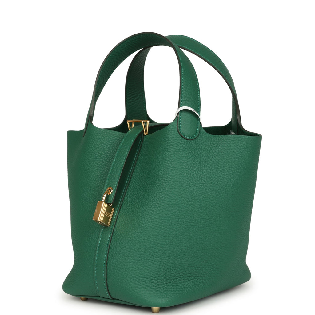 Hermes Picotin Lock 18 Vert Moyen Clemence Gold Hardware Shop for an authentic Hermes Picotin Lock 18 in Vert Moyen clemence leather with gold hardware in new and never worn condition at Madison Avenue Couture.