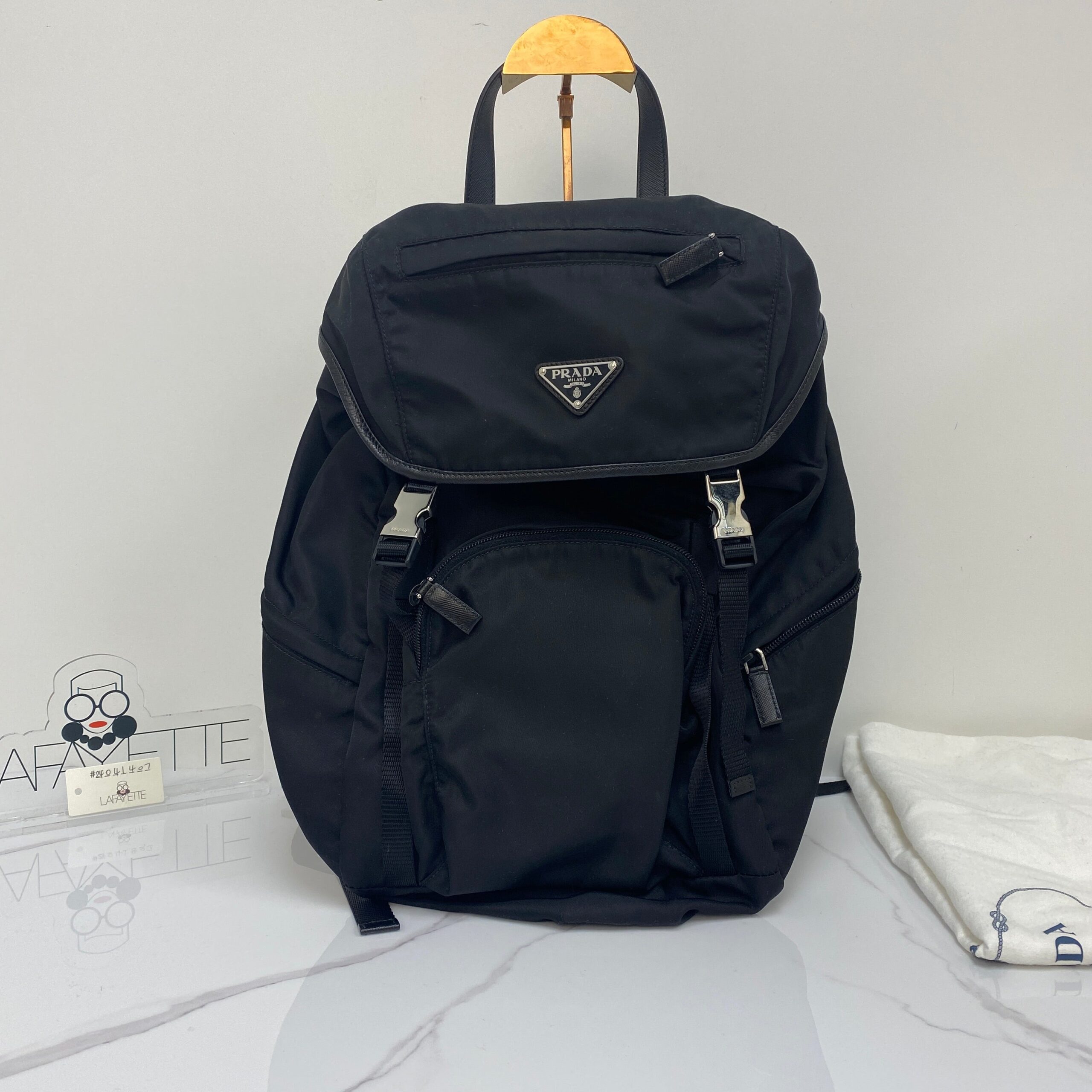 This Prada nylon backpack has evolved since the eighties and now incorporates Re-Nylon, crafted from recycled materials such as ocean plastics and textile fibers. Complemented by traditional Saffiano leather with its distinct texture and finish, the design includes a compact flap structure and a prominent front pocket, adorned with the iconic enameled metal triangle logo.