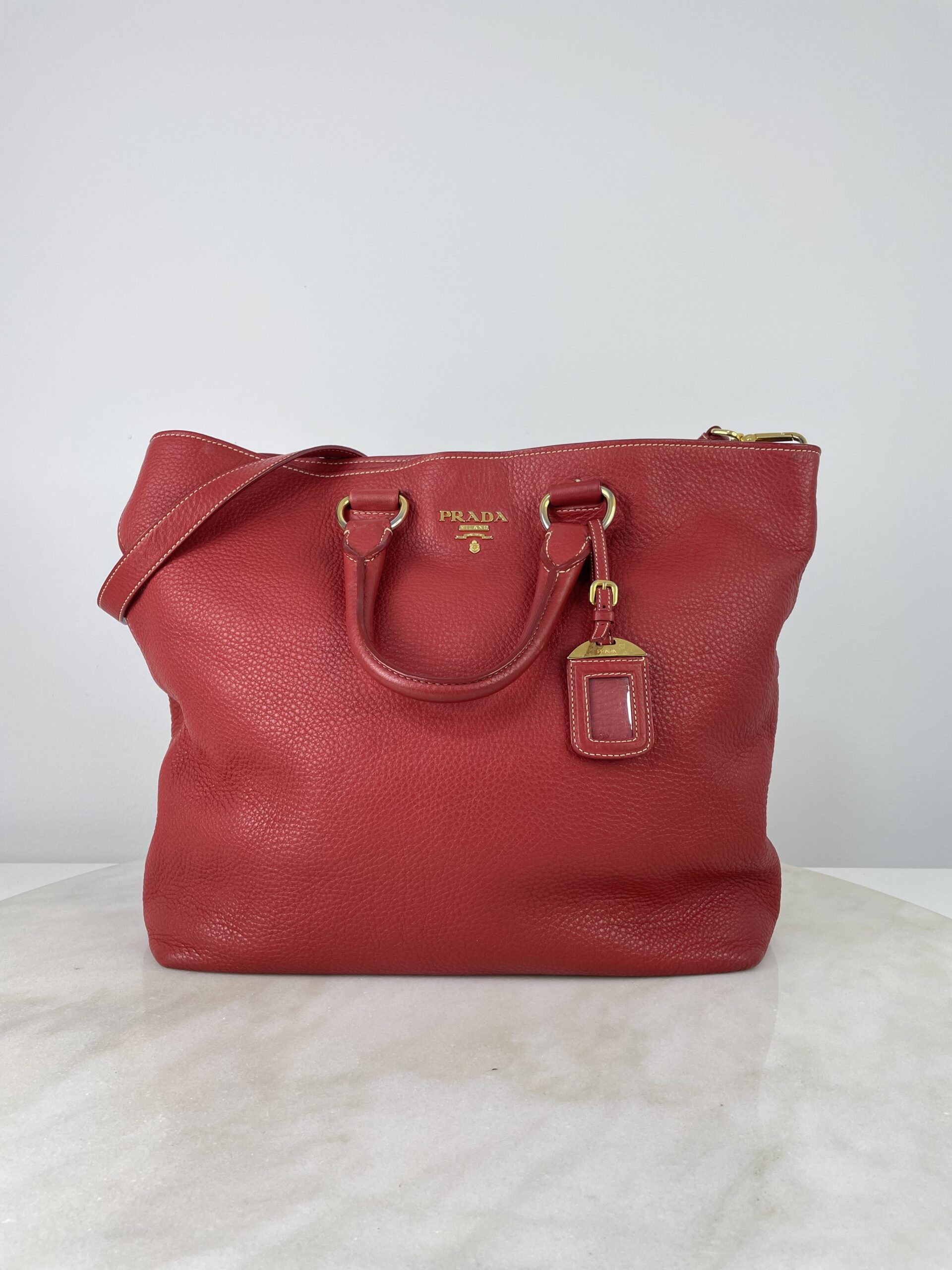 Prada Red Vitello Daino Tote Bag W/ Strap