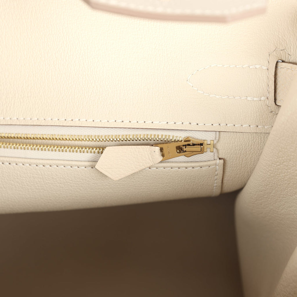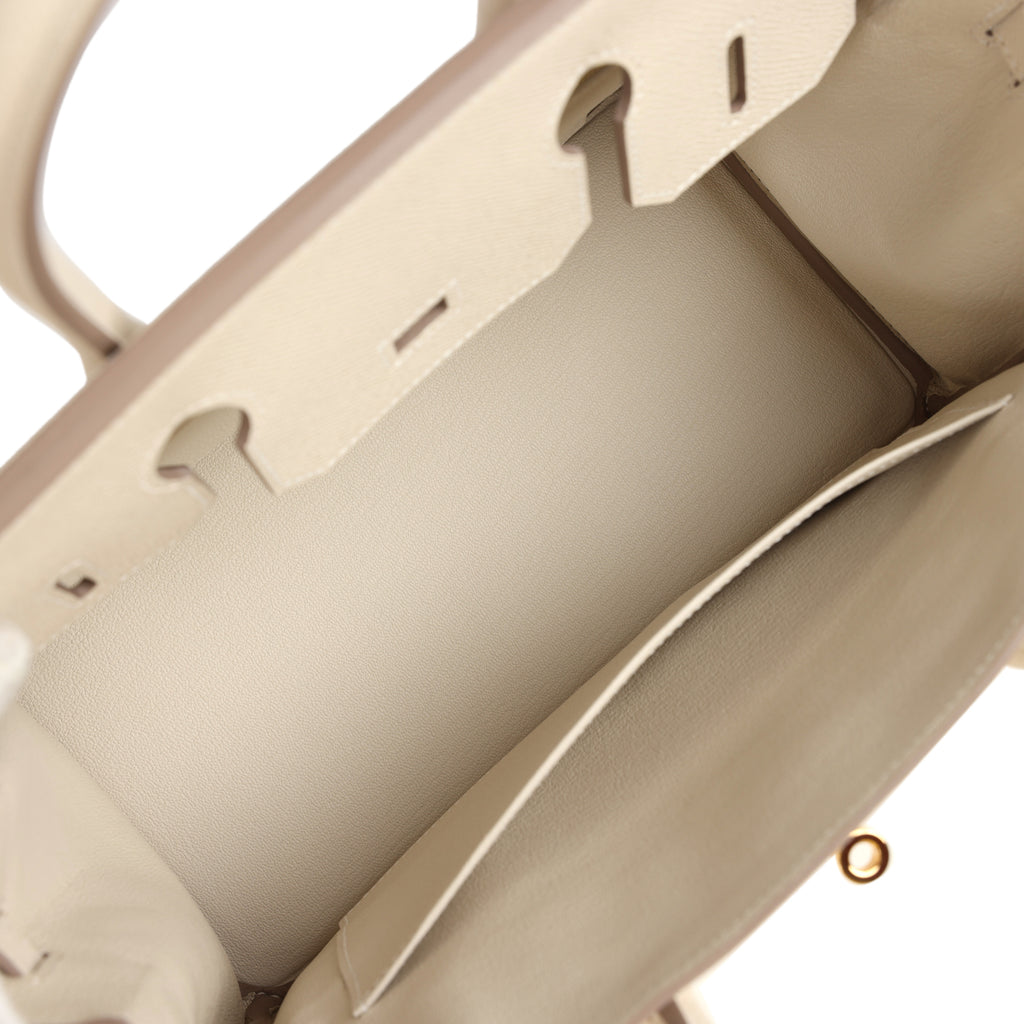 This Birkin is in Craie epsom leather with gold hardware and has tonal stitching, front flap, two straps with center toggle closure, clochette with lock and two keys, and double rolled handles.The interior is lined with Craie chevre and has one zip pocket with an Hermes engraved zipper pull and an open pocket on the opposite side.Collection: B (2023)Origin: FranceCondition: Pre-owned; Excellent to Mint – This bag retains its shape structure. The exterior leather is clean overall with a small scuff mark to the back of the bag on the edge piping. There are no other signs of wear. The is plastic on the hardware except partially on the turnlock. The exterior rivets have minor discoloration. The interior leather is clean with no signs of wear.Accompanied by: Hermes box (pre-owned), Hermes dustbag, clochette, lock, two keys, clochette dustbag, carebook Measurements: 11.75″ width x 9.5″ height x 6″ depth; 4.25″ handle drop