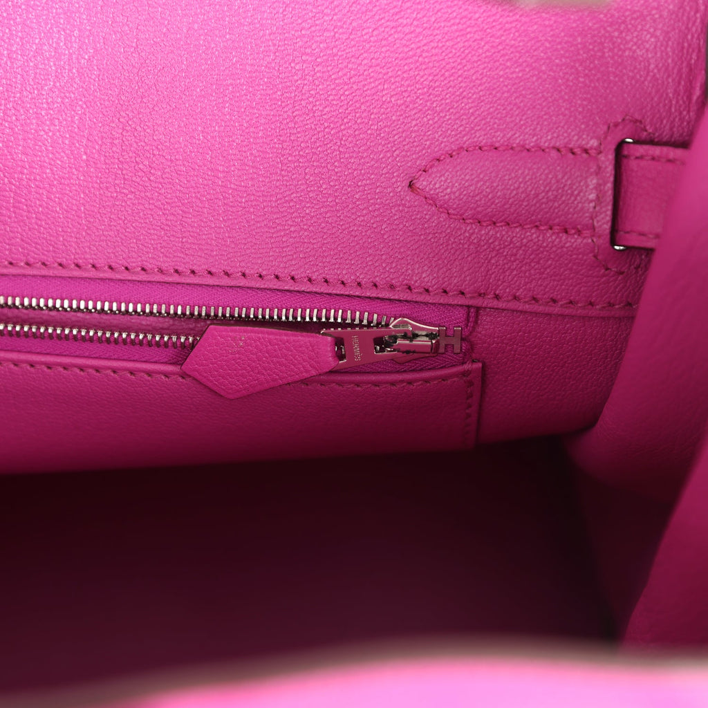 This Birkin is in Magnolia Novillo leather with palladium hardware, and has tonal stitching, front flap with two straps, front toggle closure, clochette with lock and two keys, and double rolled handles.The interior is lined in Magnolia chevre leather and has one zip pocket with Hermes engraved pull; pocket on opposite side.Collection: D (2019) Origin: FranceCondition: Pre-owned; Excellent – This bag retains its shape structure. There is no plastic on the hardware, resulting in light scratching to the exposed hardware except for the feet which have moderate scratching present. The exterior leather is clean with minimal signs of wear. The interior leather has some faint press marks to the base.Accompanied by: Hermes box, Hermes dustbag, felt, clochette, lock, two keys, clochette dustbag, carebook, rainhatMeasurements: 11.75″ width x 9.5″ height x 6″ depth; 4.25″ handle drop