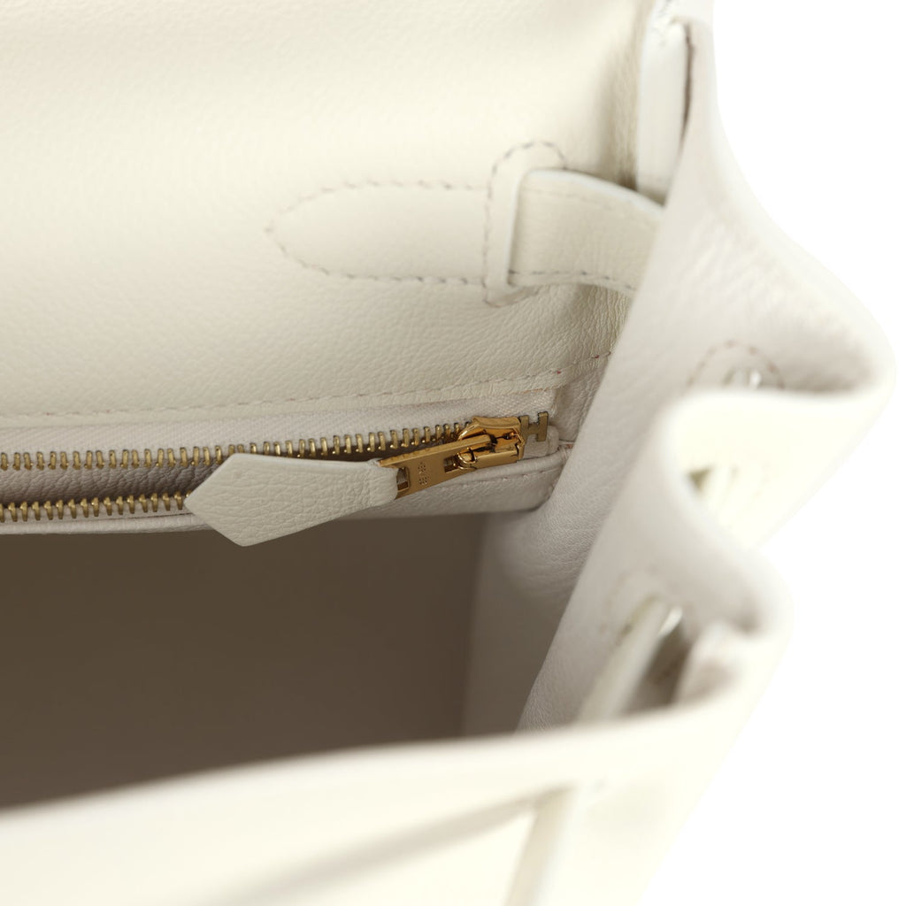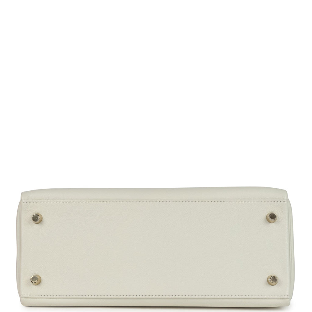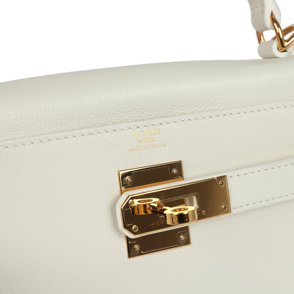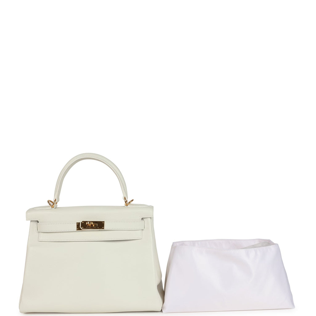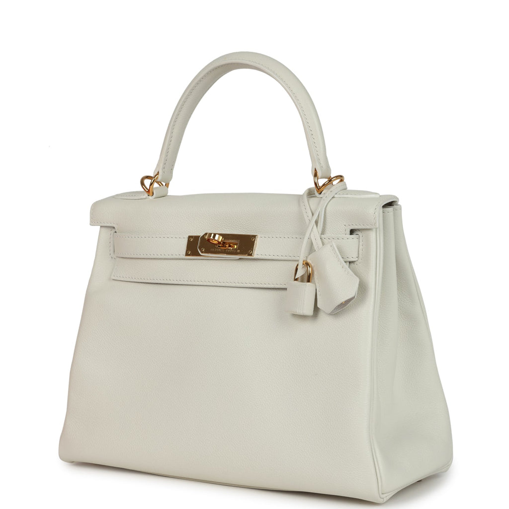 Pre-owned Hermes Kelly Retourne 28 White Evercolor Gold Hardware Shop for an authentic pre-owned Hermes Kelly Retourne 28 in White evercolor leather with gold hardware in mint condition at Madison Avenue Couture.