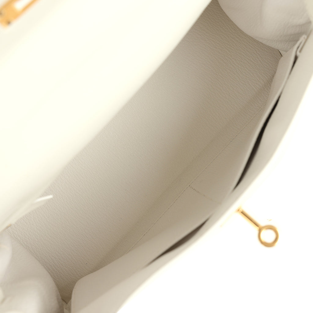 This Kelly, in the Retourne style, is in White Evercolor clemence leather with gold hardware and has tonal stitching, front flap, two straps with center toggle closure, clochette with lock and two keys, single rolled handle and a removable shoulder strap.The interior is lined in White chevre and has one zip pocket with Hermes engraved pull and two open pockets on the opposite side.Collection: Y (2020)Origin: FranceCondition: Pre-owned; Mint – This bag retains its shape. There is plastic on the hardware except for the turnlock and the shoulder strap clasps, however only the feet have original plastic. The exposed hardware and resealed hardware has some hairline scratches present. The exterior leather is lean, but there is some light creasing to the front left bottom corner. The interior is clean with minimal signs of wear.Accompanied by: Hermes box, Hermes dustbag, felt, clochette, clochette dustbag, lock, two keys, shoulder strap, shoulder strap dustbag, rainhat, carebookMeasurements: 11.25″ width x 8.25″ height x 4.75″ depth; 3.5″ handle drop (16.5″ shoulder strap drop)