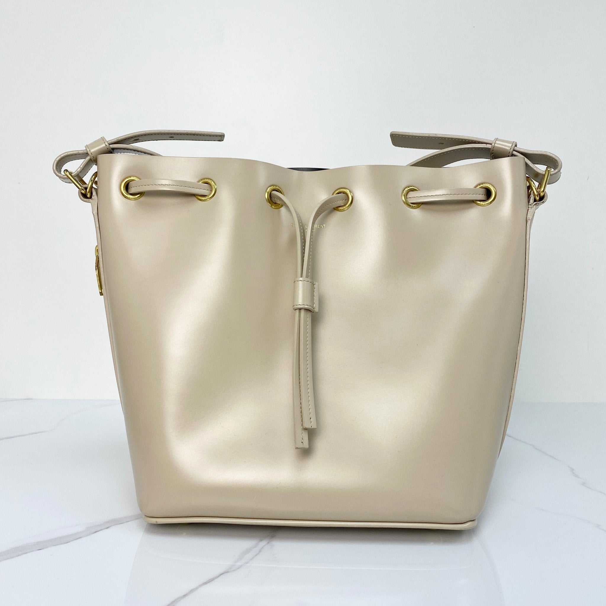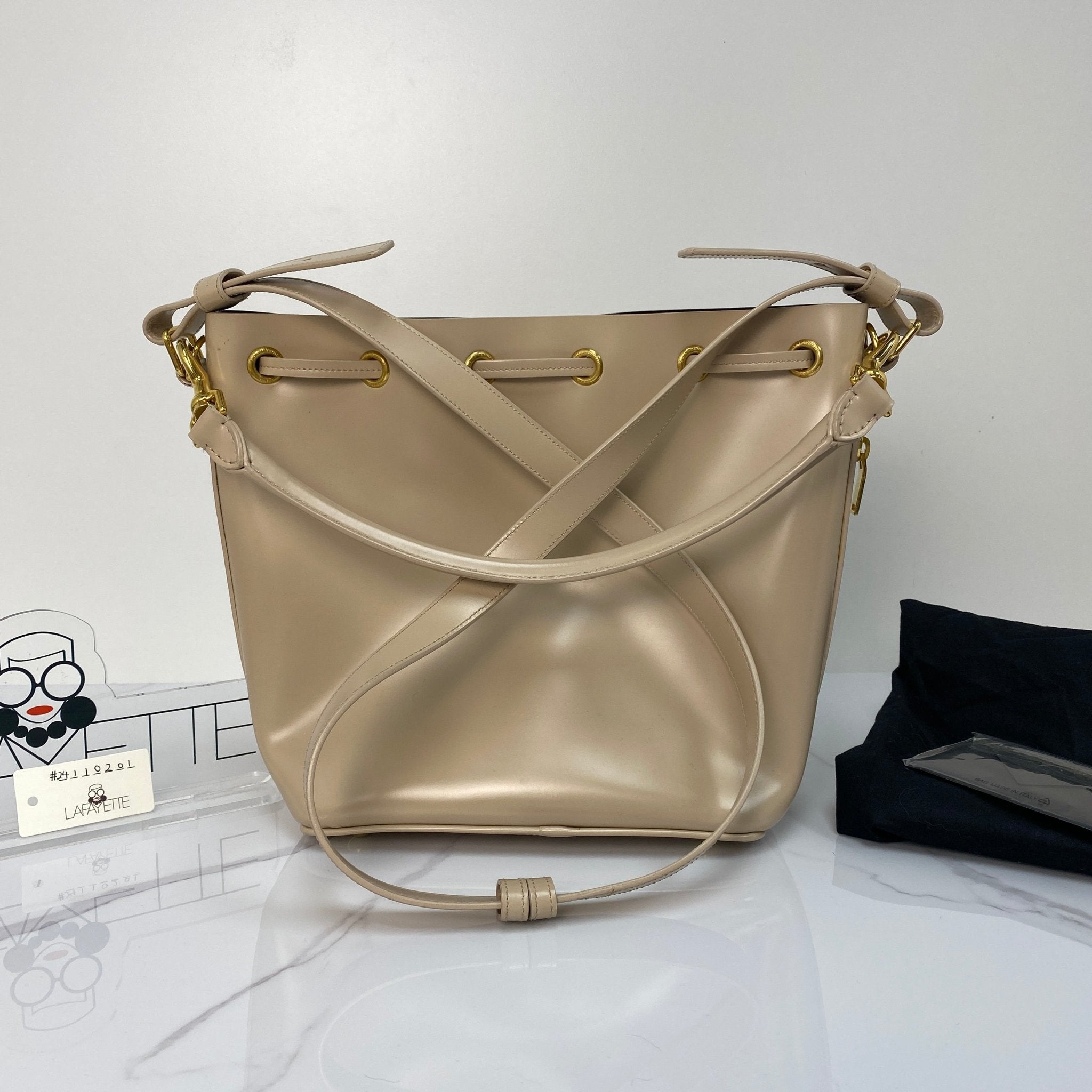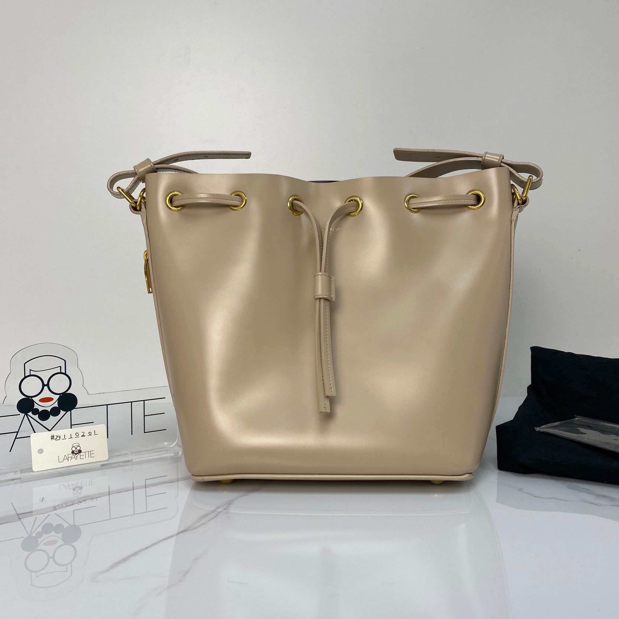 The Saint Laurent Bucket Bag in beige calfskin is the ultimate go-to. Its sleek design and neutral tone make it versatile enough for any outfit, whether you’re dressing up or keeping it casual.