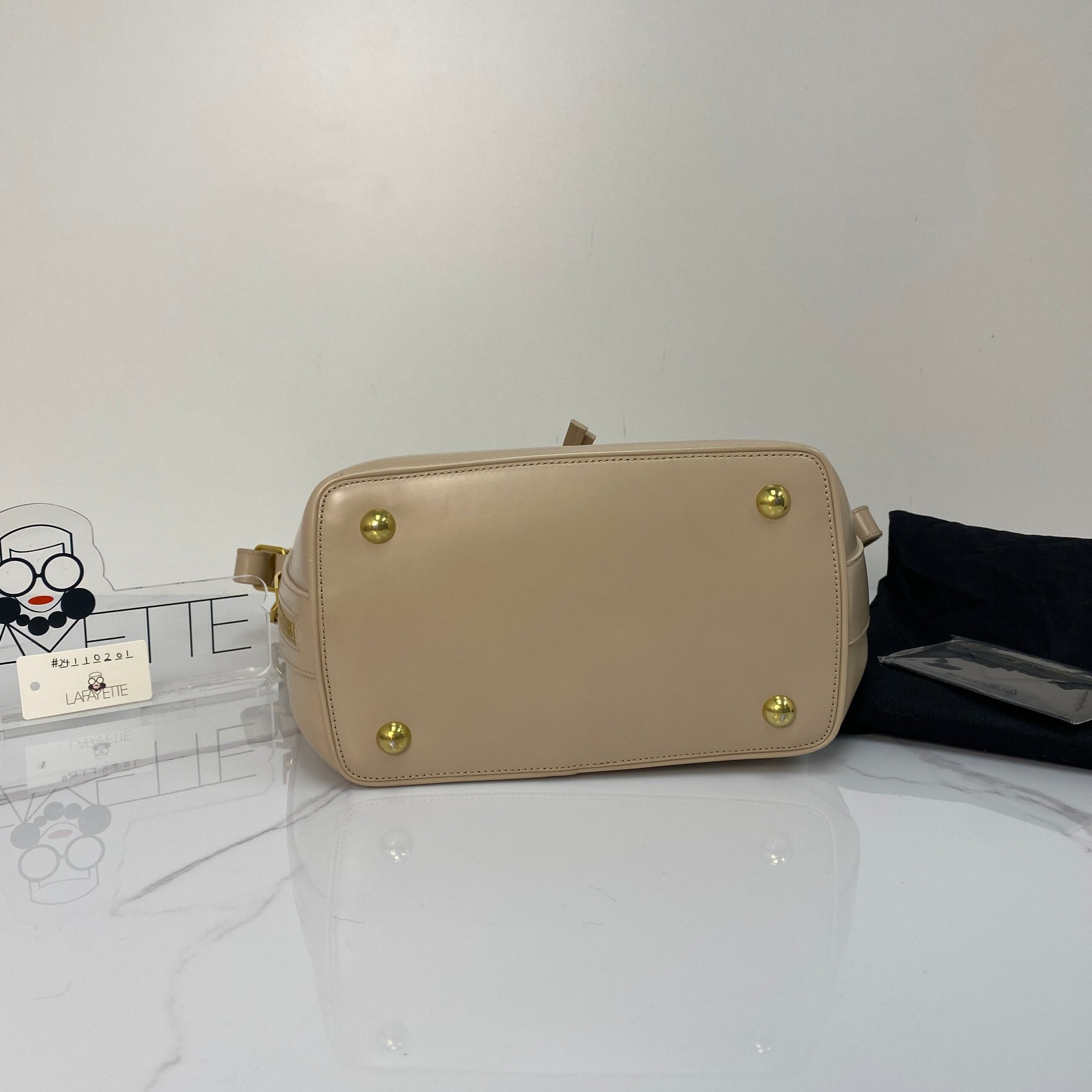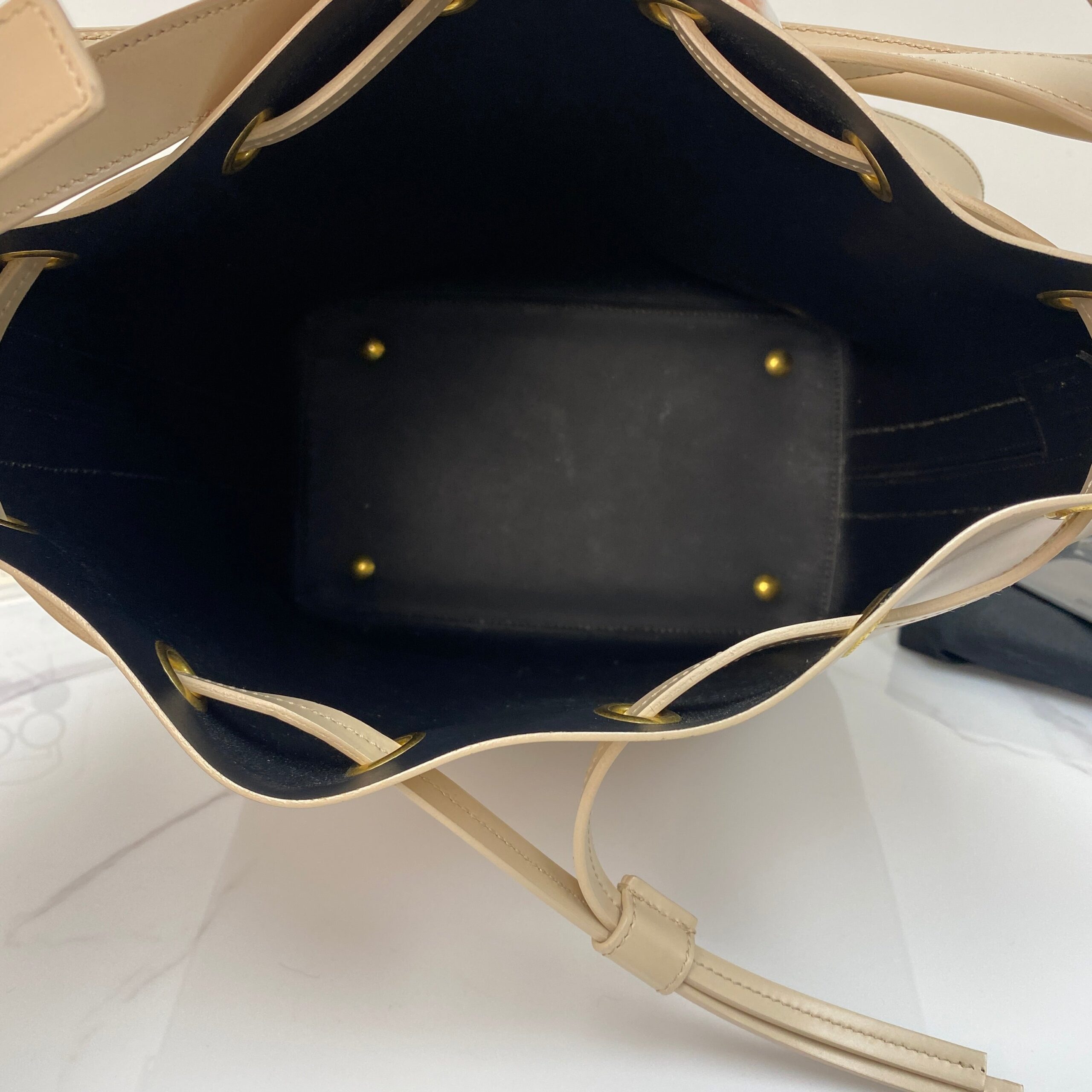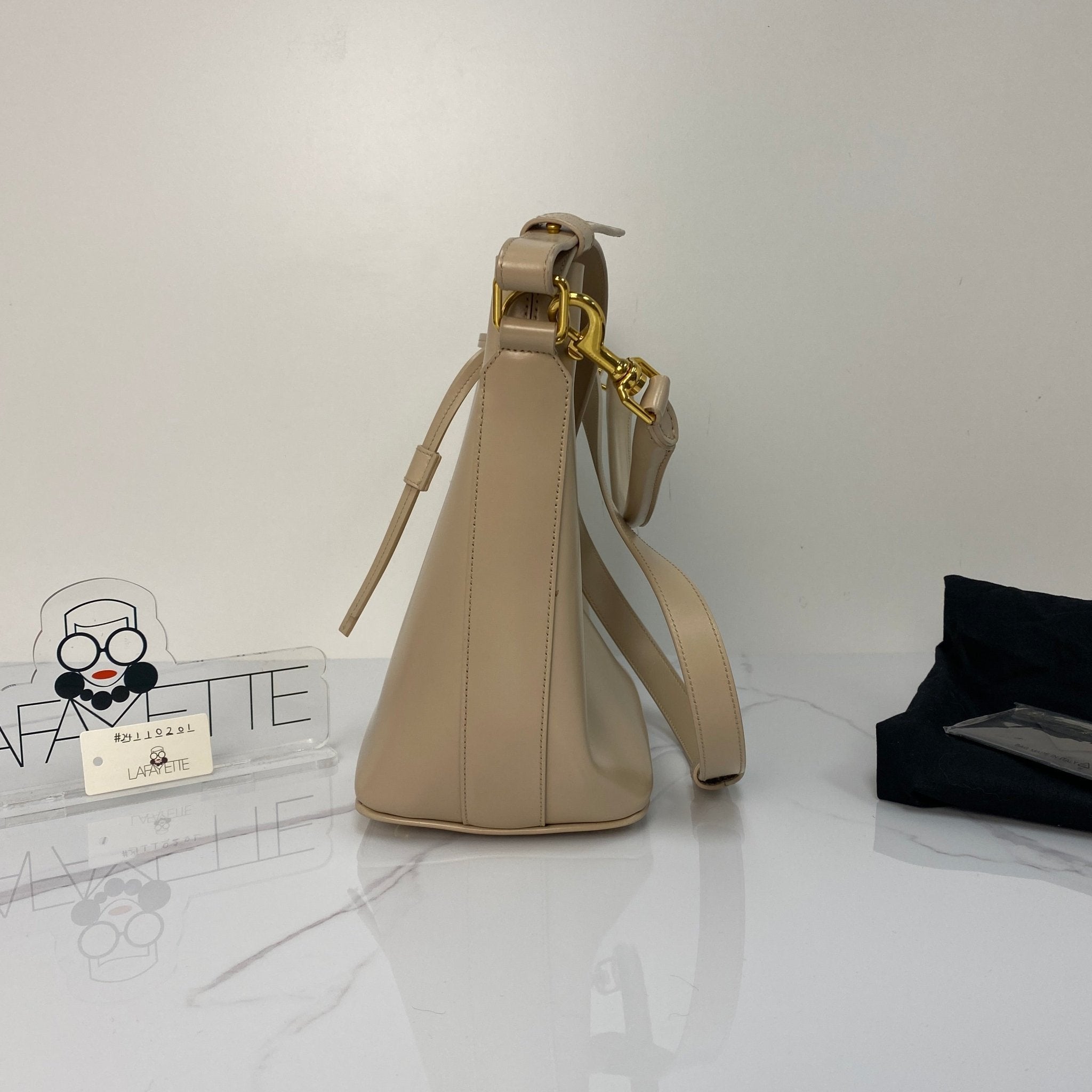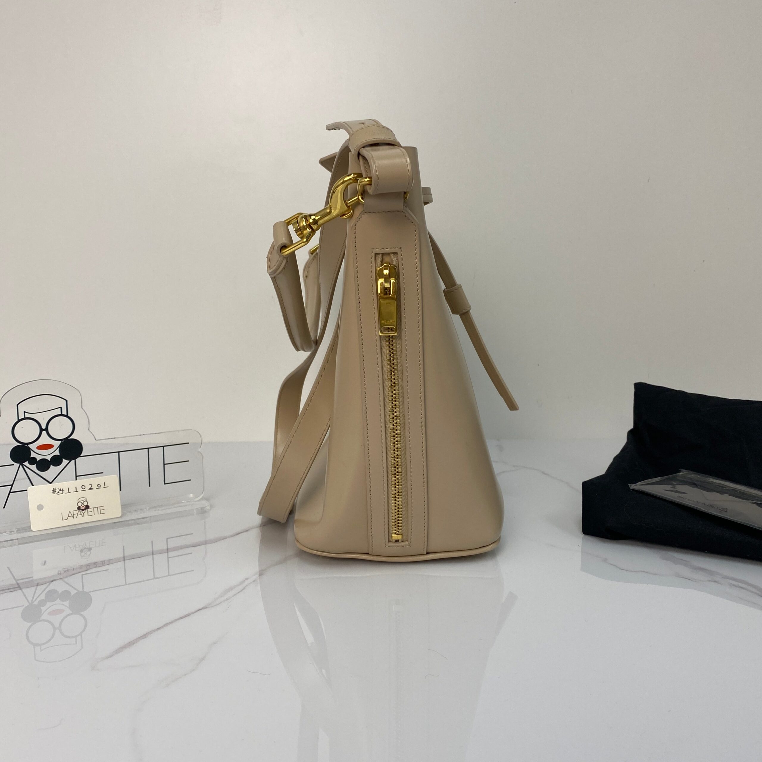 The Saint Laurent Bucket Bag in beige calfskin is the ultimate go-to. Its sleek design and neutral tone make it versatile enough for any outfit, whether you’re dressing up or keeping it casual.