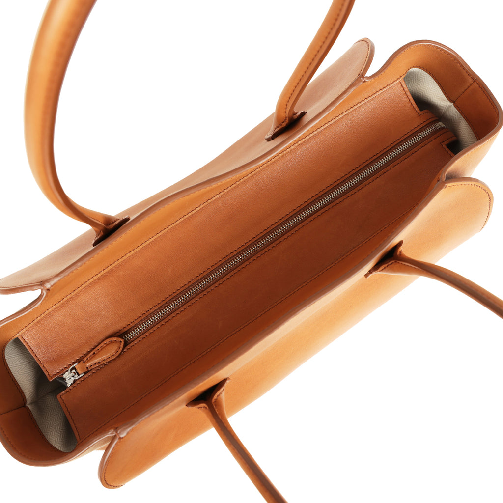 This Marlo 14 Tote Bag is in Cuir polished saddle leather with silver hardware, featuring tonal stitching, tubular top handles, gusseted side panels, and a top zipper closure.The interior is lined in Cuir polished saddle leather and beige canvas has one interior zip pocket and two slip pockets.