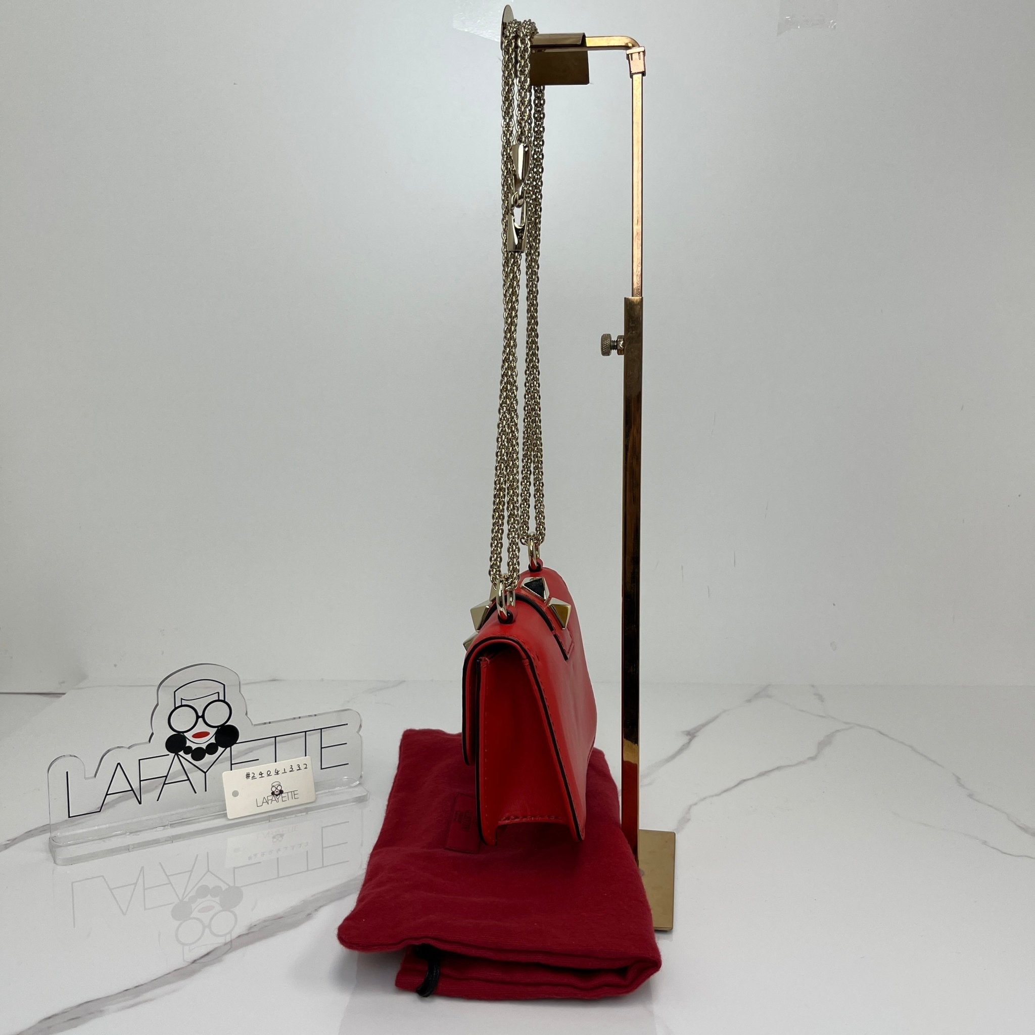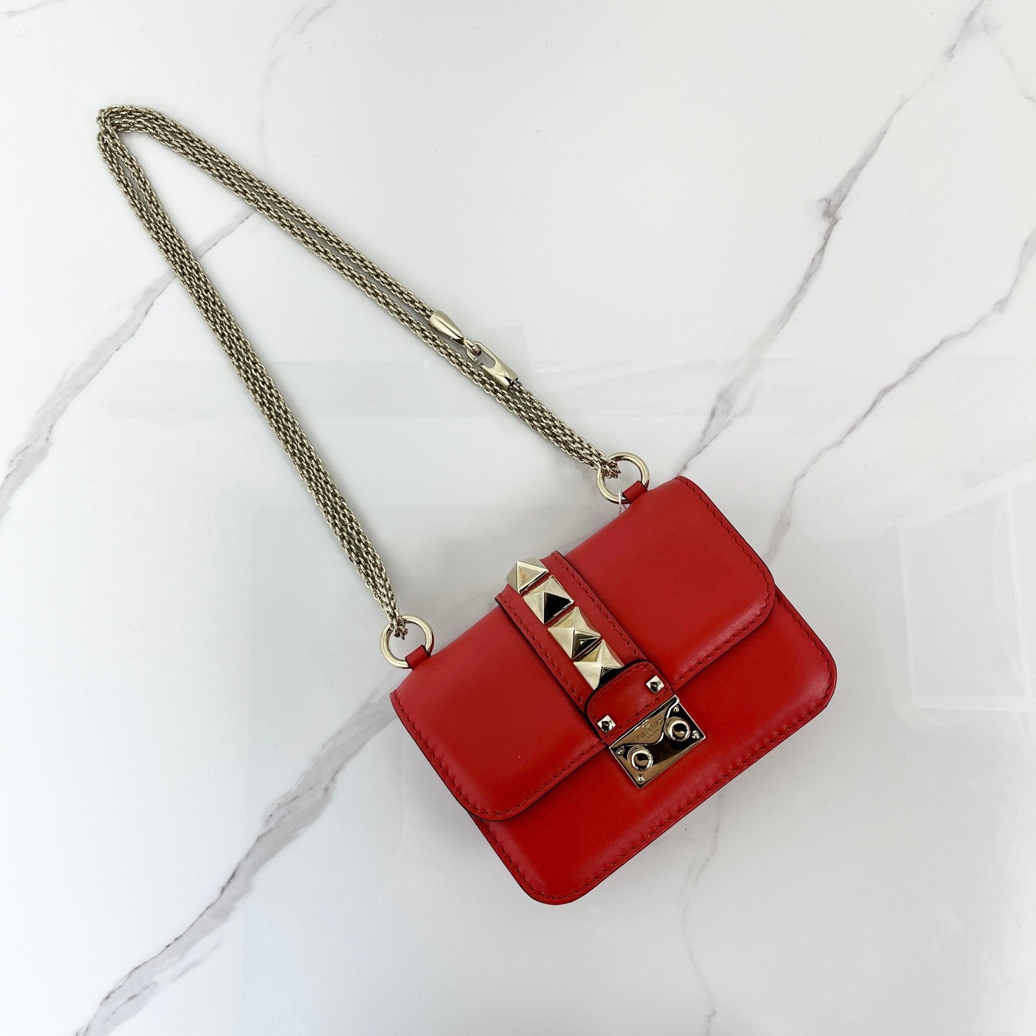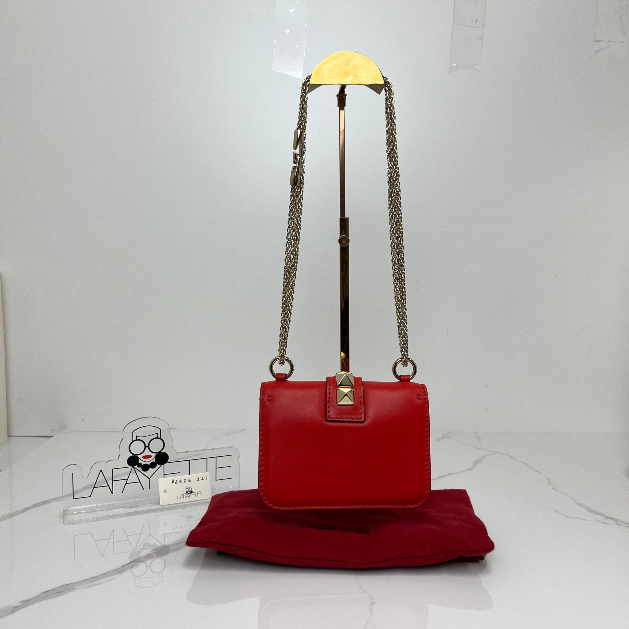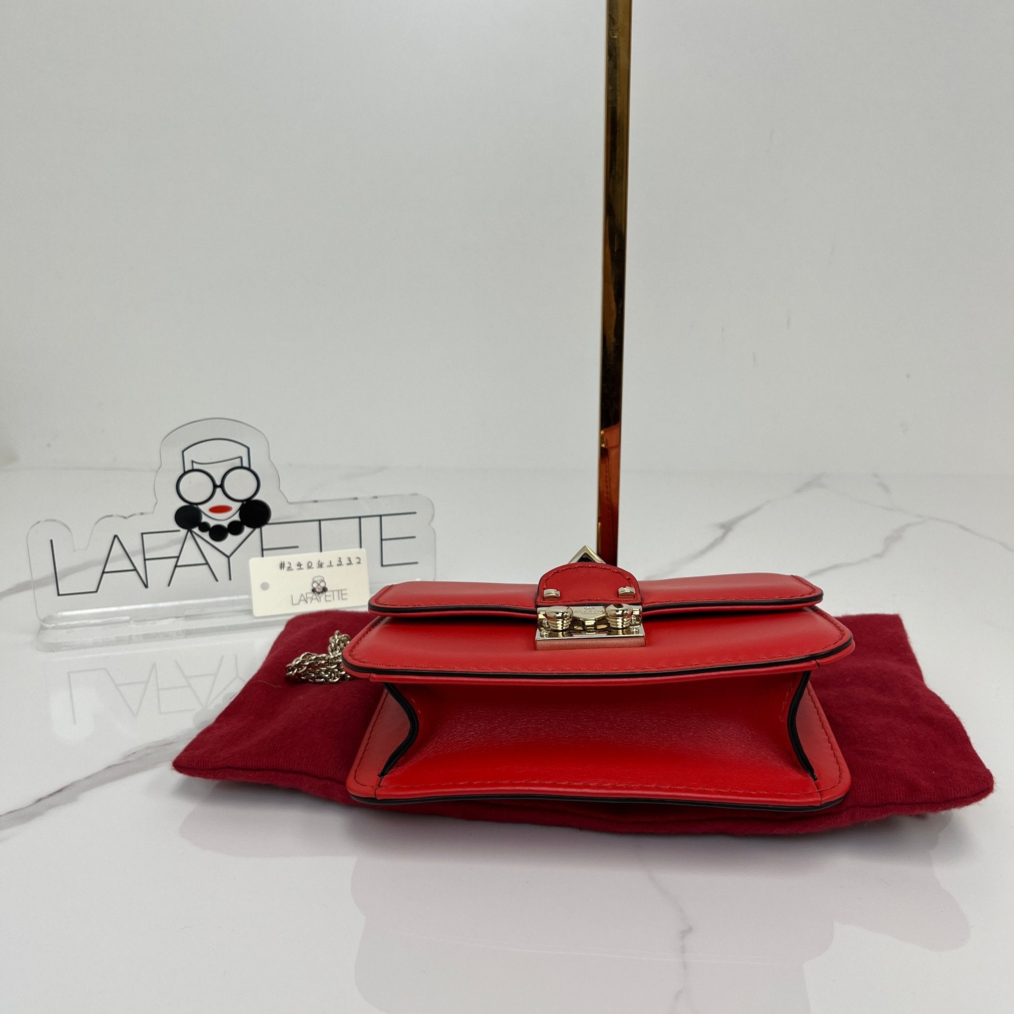 Make a fiery statement this season with the Valentino Rockstud Glam Lock in vermillion. Perfectly on-trend, this lambskin bag with signature rockstuds adds a splash of bold color and luxe texture to your wardrobe, ensuring you capture the spotlight wherever you go.
