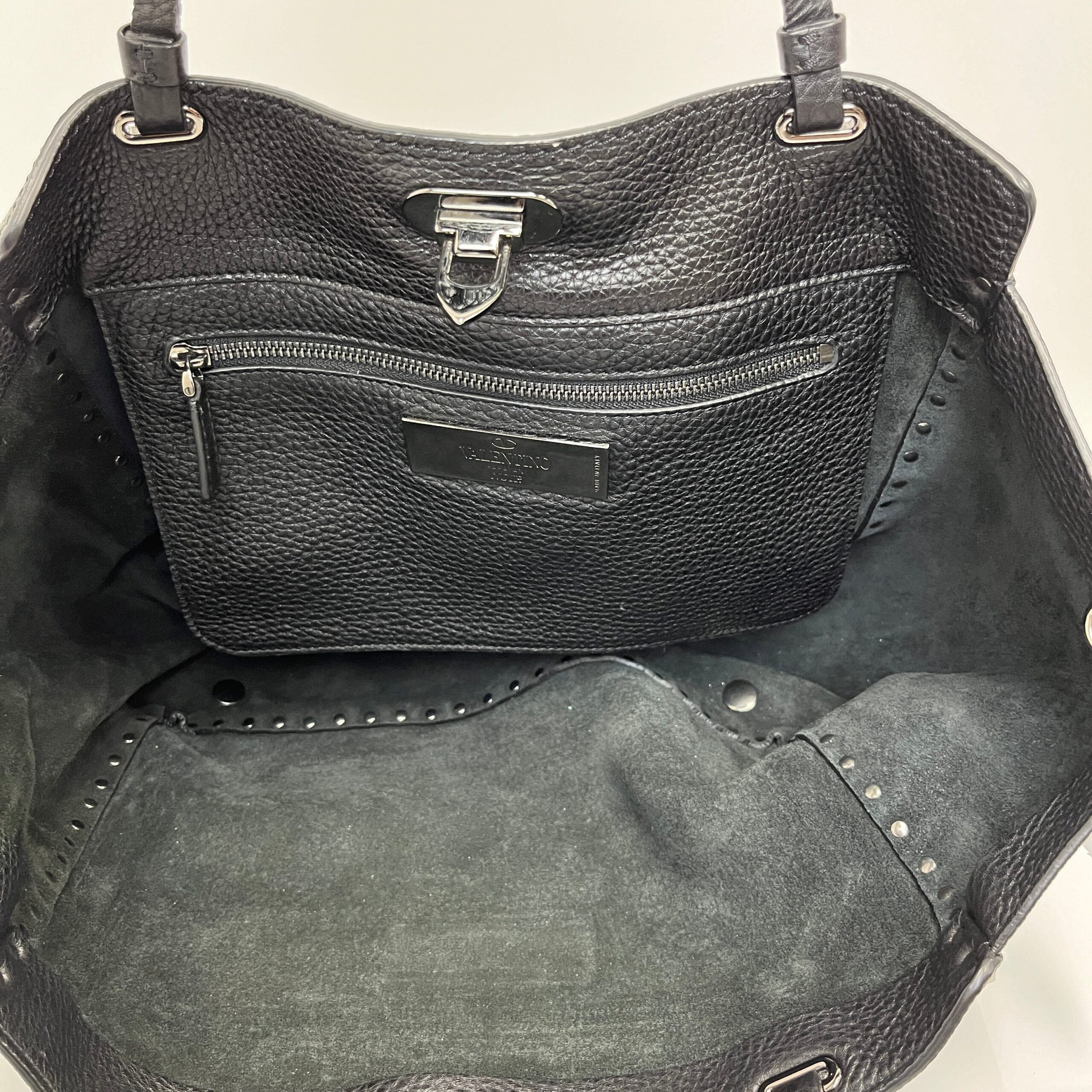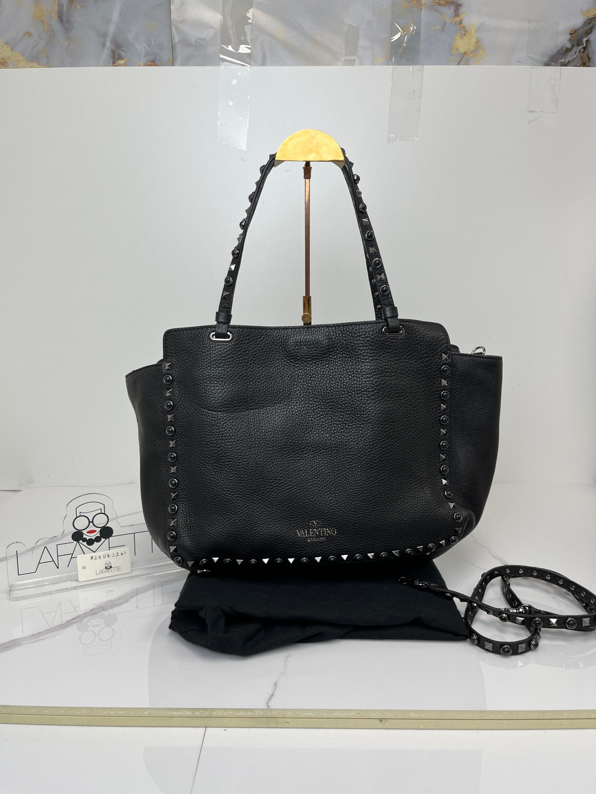 Experience the perfect blend of boldness and beauty with the Valentino Rockstud Tote. Crafted from premium black grainy calfskin and adorned with signature studs, this bag is not just a carry-all—it’s a showstopper. Embrace your fearless side with every carry.